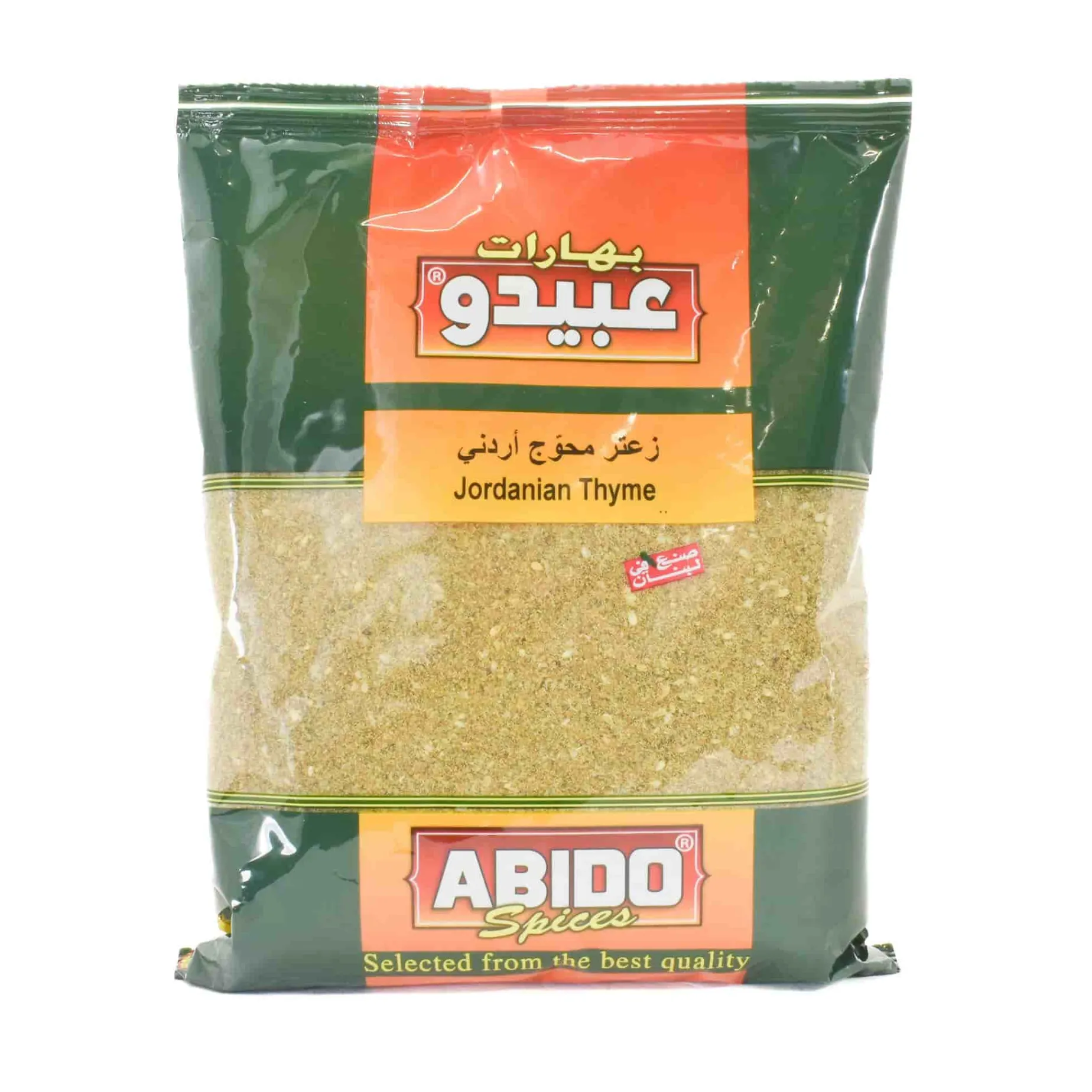 Abido Jordanian thyme is a fragrant spice & herb blend for Middle Eastern cooking. Made of thyme, sesame seeds, freekeh, sumac and salt, this nutty mix has a mild acidity that cuts through the richness of meat dishes or creamy dips.