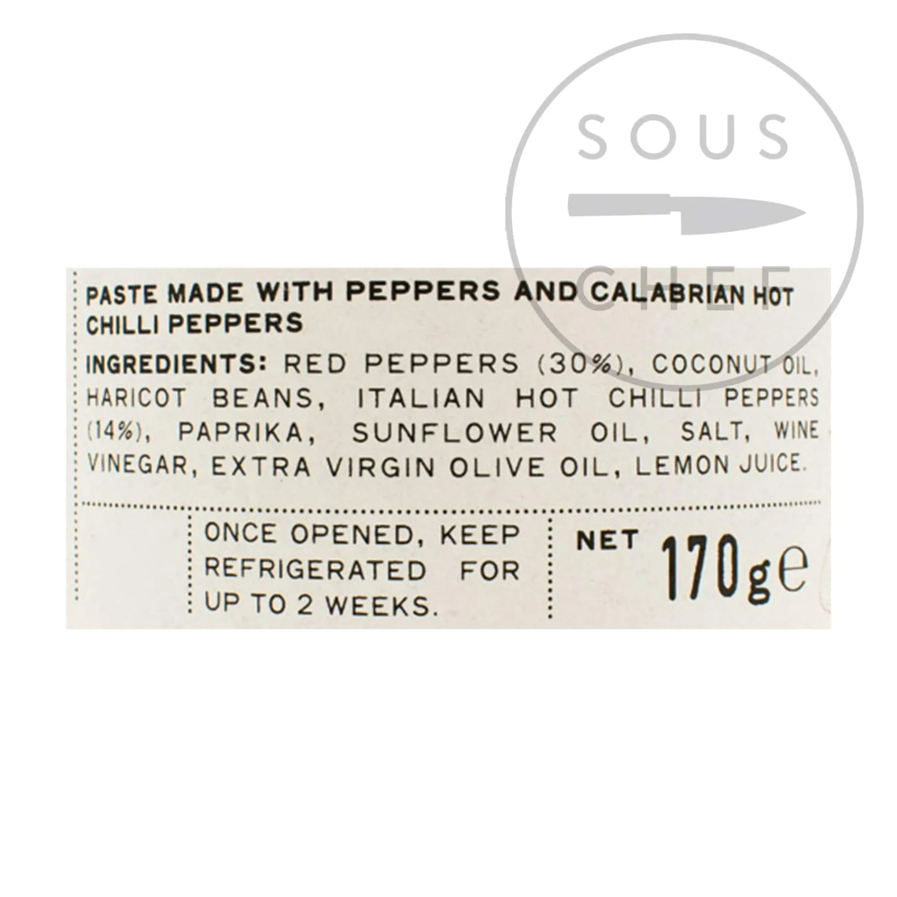 Product formulations and details may change. For the latest ingredients and allergen information always check product packaging prior to consumption. Ingredients: red peppers (30%), coconut oil, haricot beans, Italian hot chilli peppers (14%), paprika, sunflower oil, salt, wine vinegar, extra virgin olive oil, lemon juice.