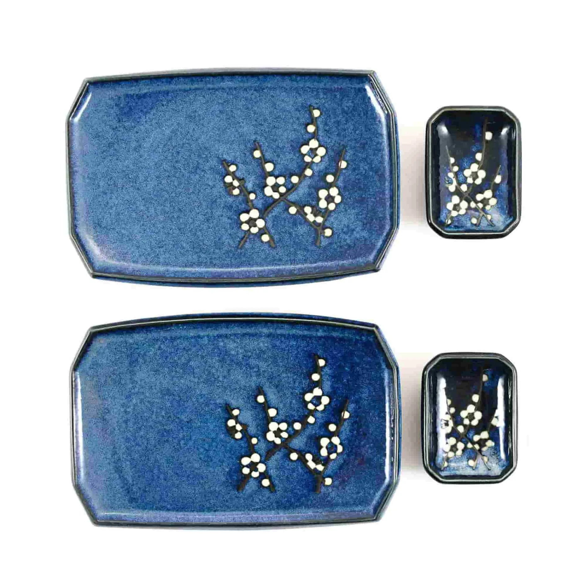 The dark blue stoneware plates and dishes are decorated with a traditional Japanese sakura blossom pattern. Serve sushi on the long plates, and fill the smaller dishes with soy sauce, pickled ginger or ponzu dressing,