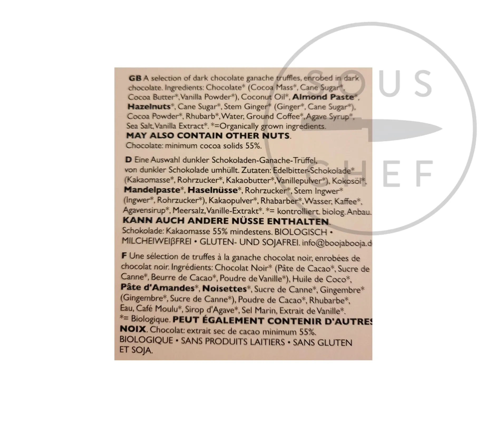 Product formulations and details may change. For the latest ingredients and allergen information always check product packaging prior to consumption. Ingredients: Chocolate* (cocoa mass*, cane sugar*, cocoa butter*, vanilla powder*), coconut oil*, almond paste*, hazelnuts*, cane sugar*, stem ginger* (ginger*, cane sugar*), cocoa powder*, rhubarb*, water, ground coffee*, agave syrup*, sea salt, vanilla extract*. * = organically grown ingredient.