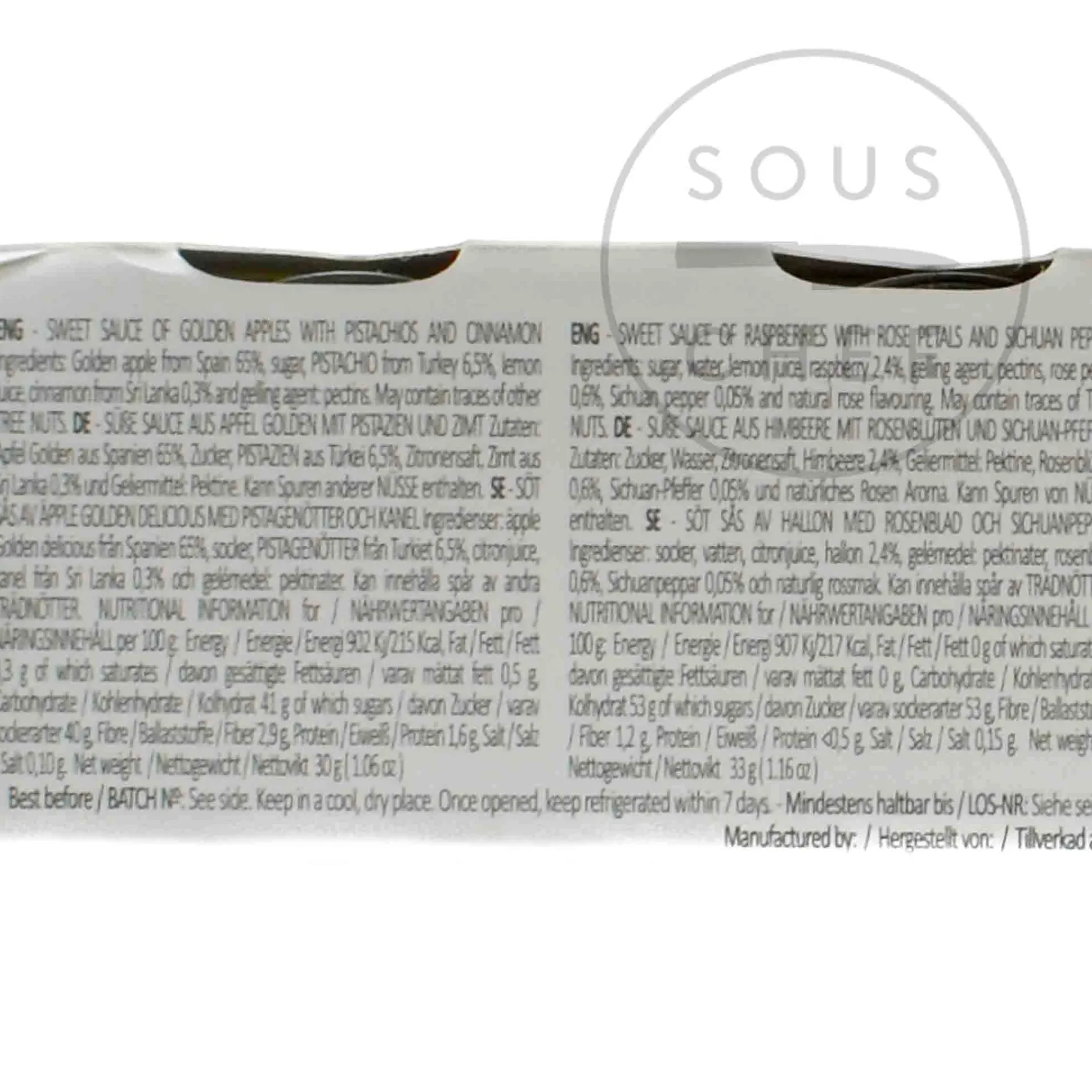 Product formulations and details may change. For the latest ingredients and allergen information always check product packaging prior to consumption. Ingredients: Raspberries: sugar, water, lemon juice, raspberries 2,4%, gelling: pectins, rose petals 0,6%, Szechuan pepper 0.05% and natural rose aroma. Black figs: black figs 61%, sugar, Australian macadamia nuts 12%, lemon juice and Jamaican allspice 0.5%. Grape: black grapes 69%, sugar, majorcan almonds 6,1%, lemon juice and gelling: pectins. Peach and apricot: peach 52%, apricot 22%, sugar, goji berries 3,7% (contains sulphites), lemon juice, gelling: pectins, and Guatemalan cardamom 0.1%. Apple: golden apples 65%, sugar, tender pistachios from Turkey 6,5%, lemon juice, Sri Lankan cinnamon 0.3% and gelling: pectins.
