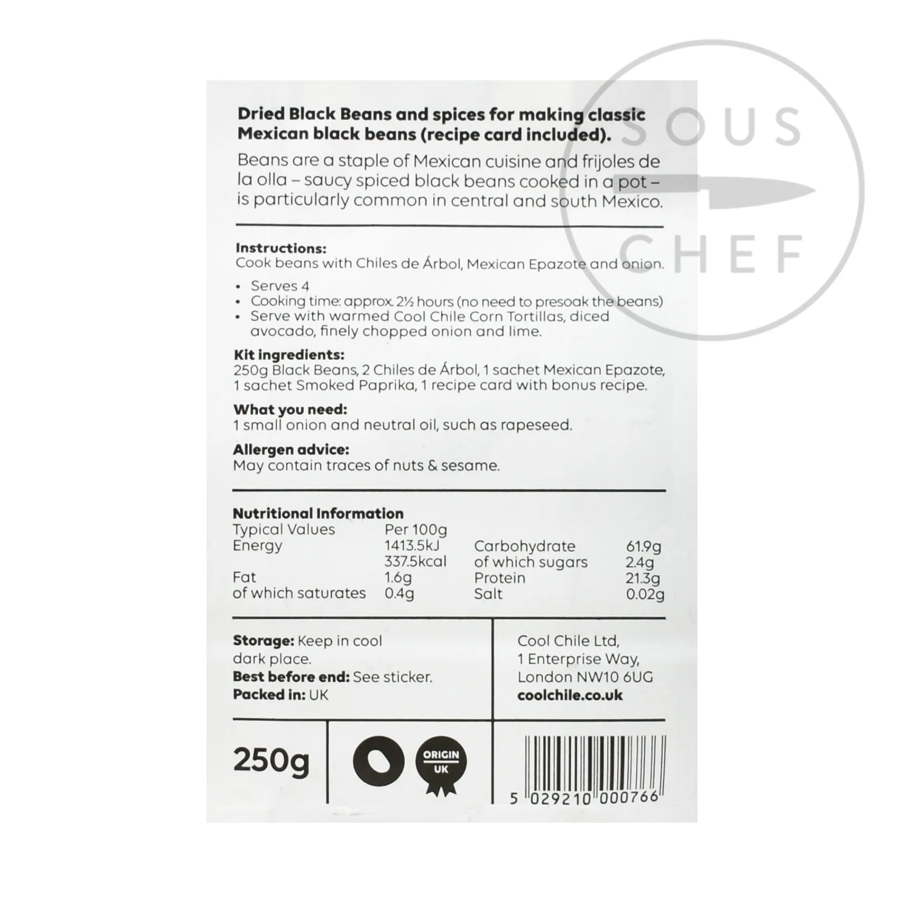 Product formulations and details may change. For the latest ingredients and allergen information always check product packaging prior to consumption. Ingredients: black bean, chile de árbol, mexican epazote, smoked paprika. May contain traces of nuts and sesame. Allergens are listed in bold.