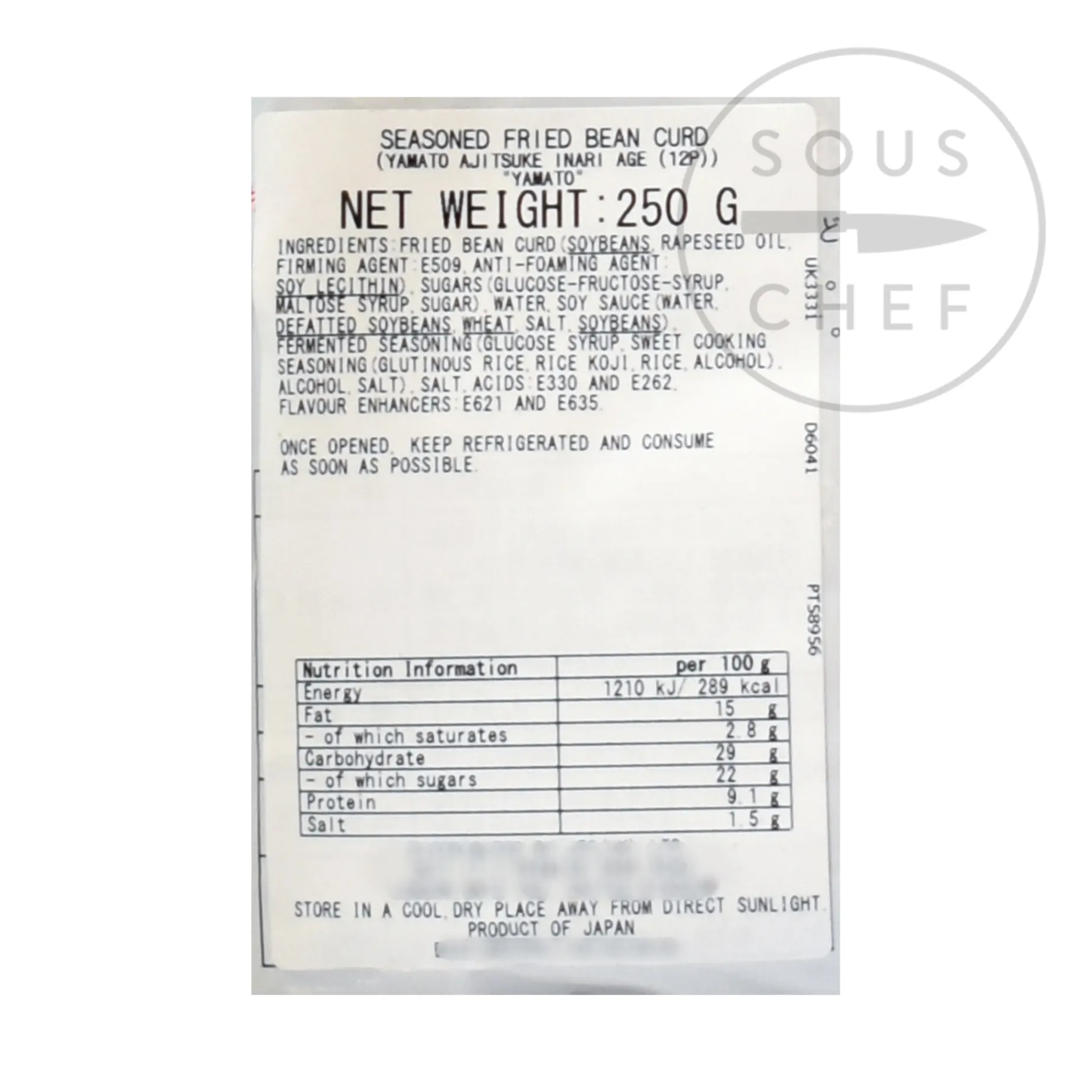 Product formulations and details may change. For the latest ingredients and allergen information always check product packaging prior to consumption. Ingredients: Fried bean curd (soybeans, rapeseed oil, firming agent: E509, anti-foaming agent: soy lecithin), sugars, (glucose-fructose syrup, maltose syrup, sugar), water, soy sauce (water, defatted soybeans, wheat, salt, soybeans), fermented seasoning (glucose syrup, sweet cooking seasoning [glutinous rice, rice koji, rice, alcohol], alcohol, salt), salt, acids: E330, E262, flavour enhancers: E621, E635. Contains allergens: gluten (wheat),soya. Contains monosodium glutamate.