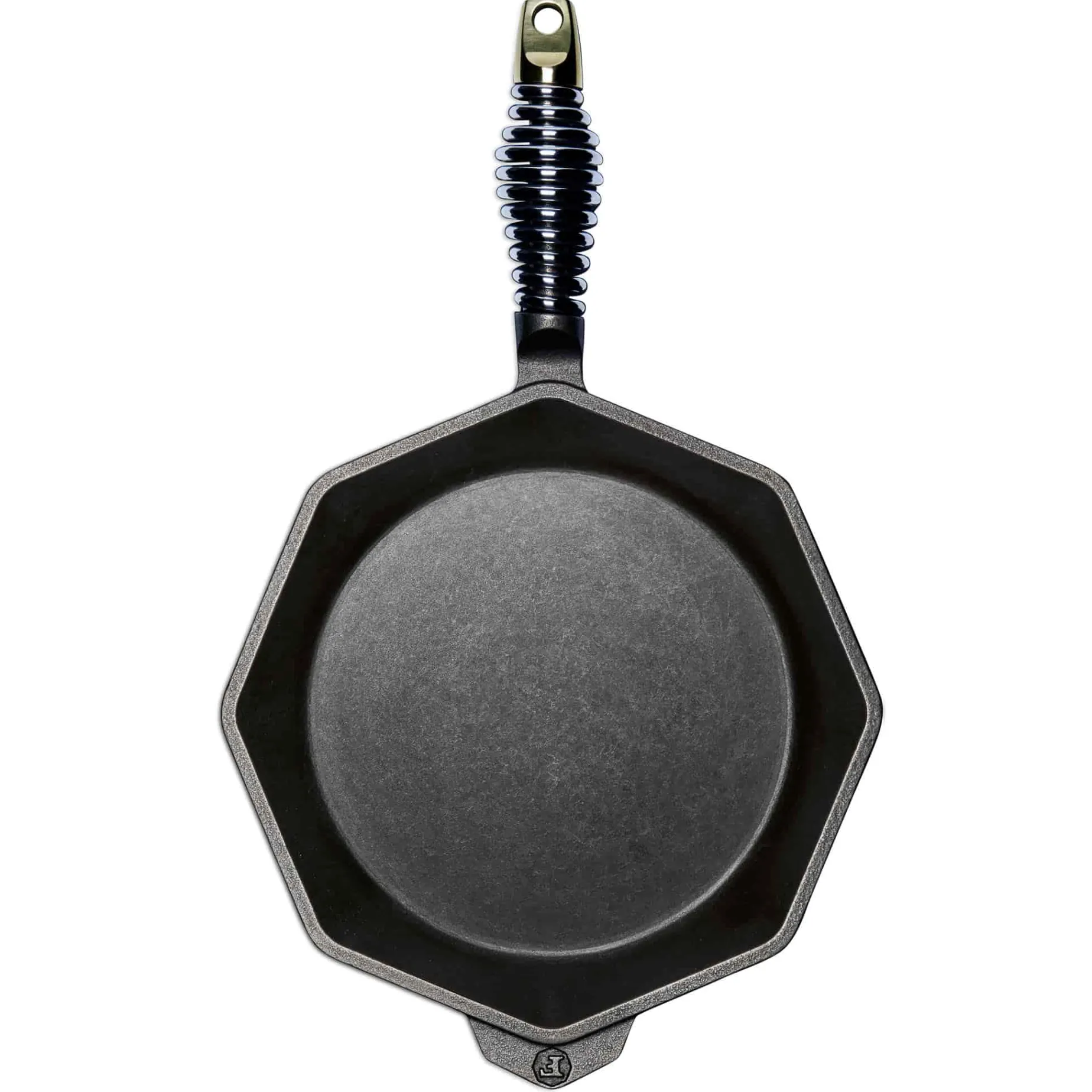 Finex cast iron skillet, by American brand, Lodge, is a unique octagonal shape. This means you can pour from the pan at any angle, making it ideal for draining away any cooking fat, pouring out deglazed juices, or decanting a caramel sauce into your serving jug.