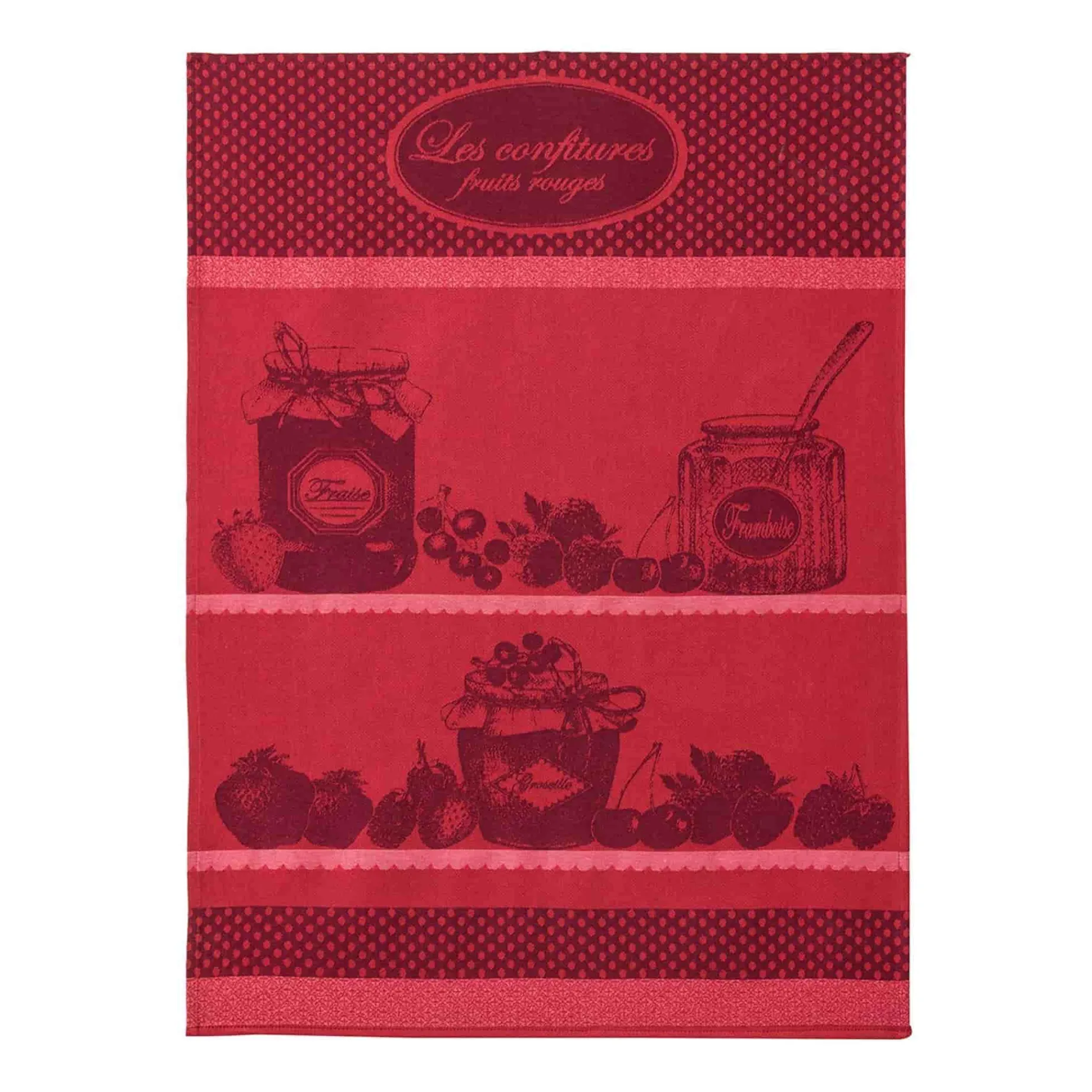 This French tea towel is emblazoned with all the accoutrements of jam-making, in dark cherry red colours. Made with 100% cotton jacquard, the towel is brilliantly absorbent and extremely hard-wearing. It looks good, and really dries the dishes in seconds. A great gift for any expert preservers!
