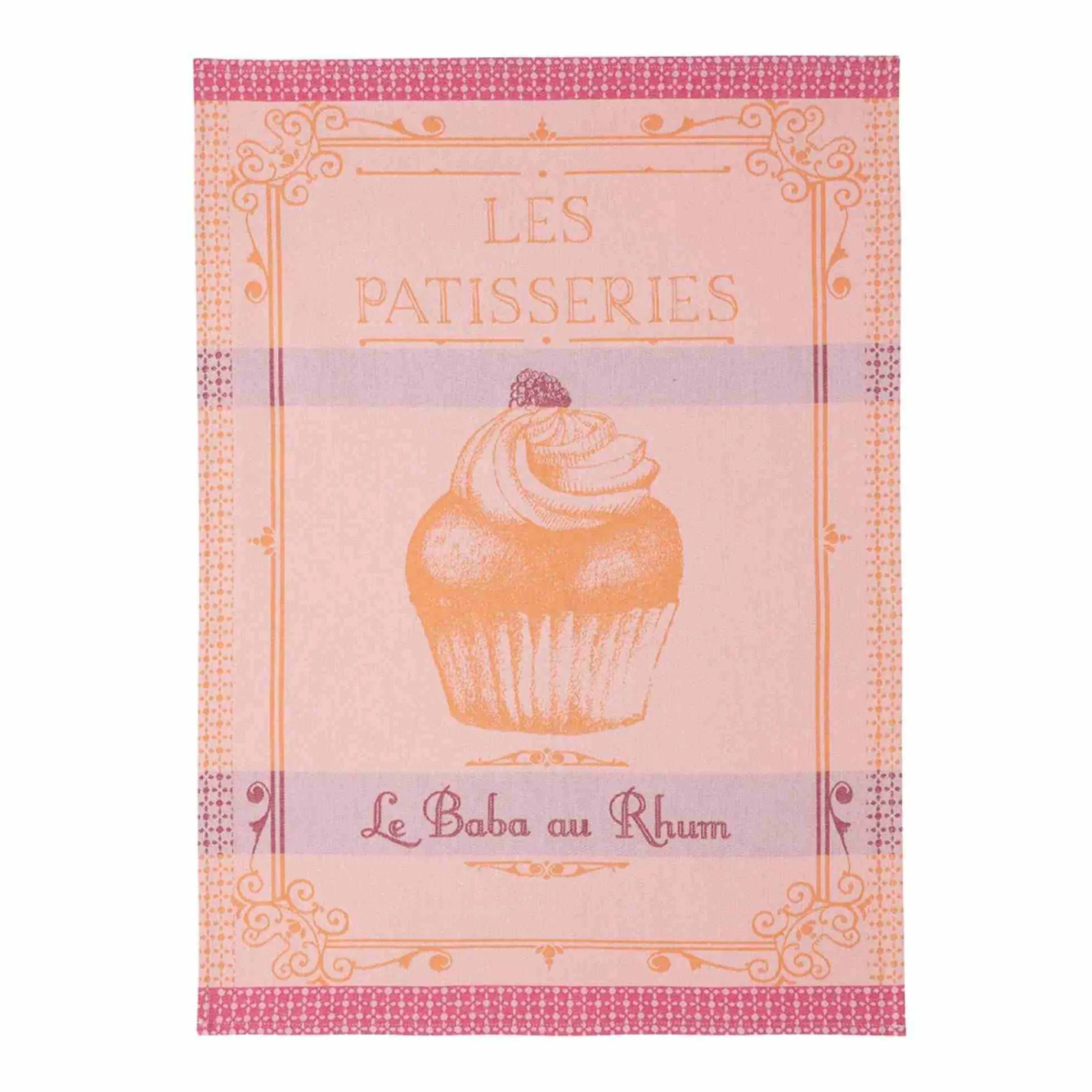 This French tea towel is illustrated with a Rum Baba – the classic Parisian soaked sponge. Beautifully decorated with cream and fruit, and in colours of soft orange and raspberry pink, this 100% cotton tea towel is a sweet touch to your kitchen linen drawer.