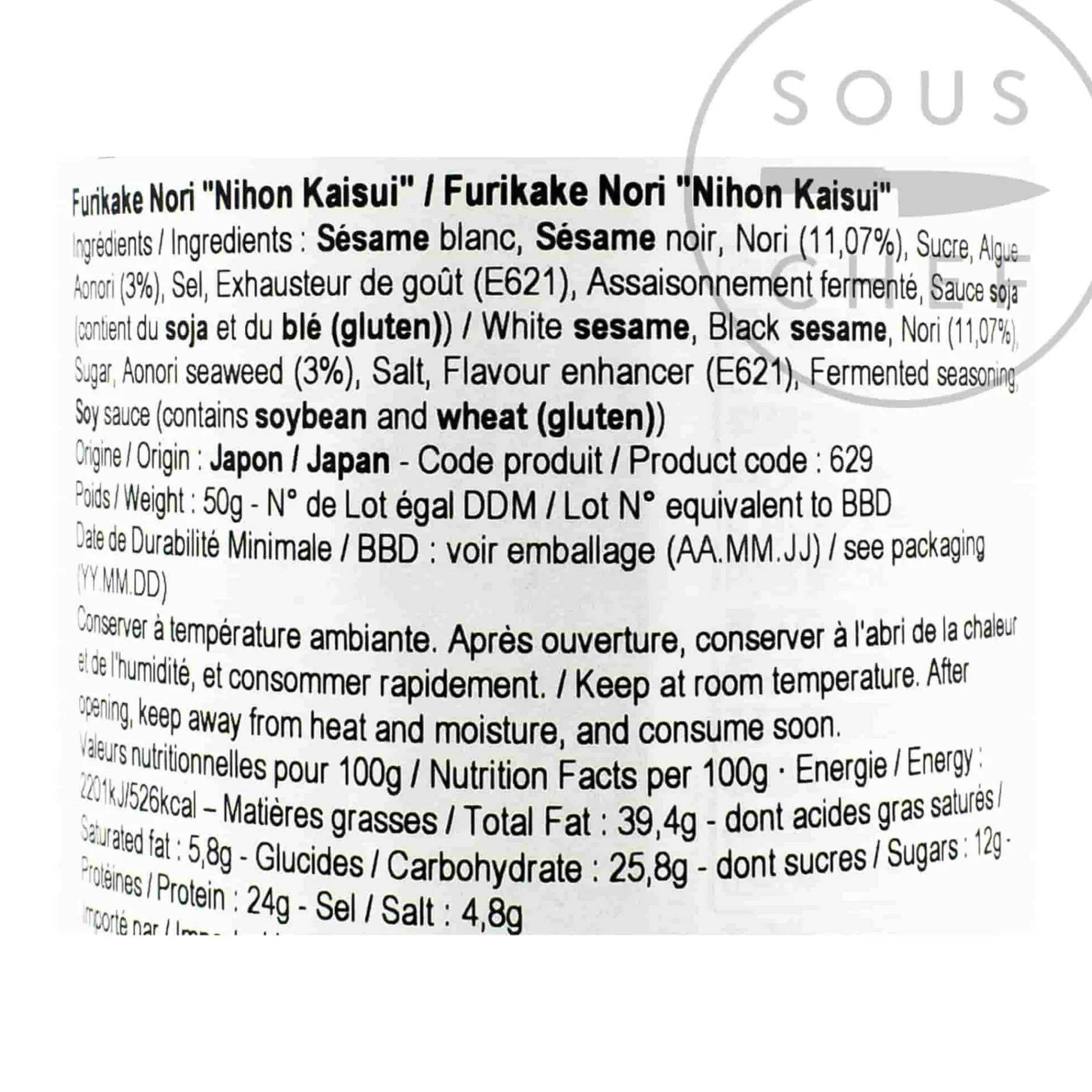 Product formulations and details may change. For the latest ingredients and allergen information always check product packaging prior to consumption. Ingredients: white sesame, black sesame, Norie (11.07%), sugar, aonori seaweed (3%), salt, flavour enhancer (E621), fermented seasoning, soy sauce (contains soybean and wheat (gluten))