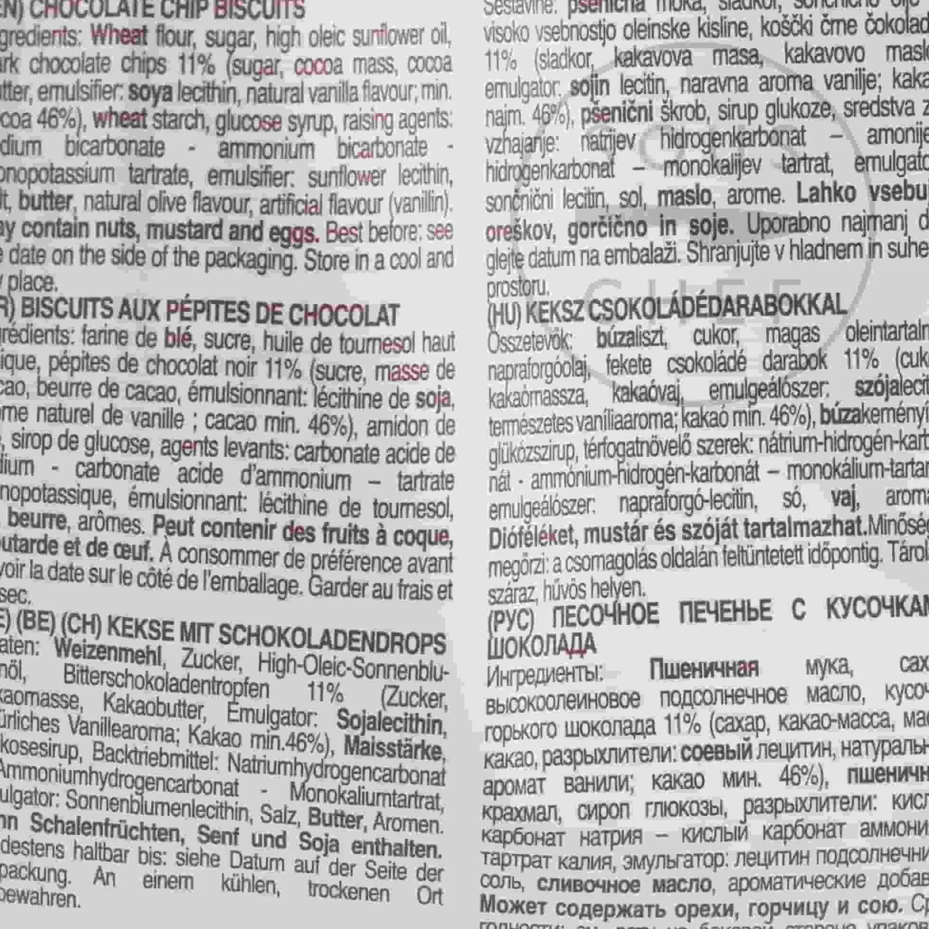 Product formulations and details may change. For the latest ingredients and allergen information always check product packaging prior to consumption. Ingredients: Wheat flour, sugar, high oleic sunflower oil, chocolate chips 11% (sugar, cocoa mass, cocoa butter, emulsifier: soy lecithin, natural vanilla flavouring; cocoa min.46%), wheat starch, glucose syrup, raising agents: sodium hydrogen carbonate – ammonium hydrogen carbonate, monopotassium tartrate, emulsifier: sunflower lecithin, salt, butter, flavourings