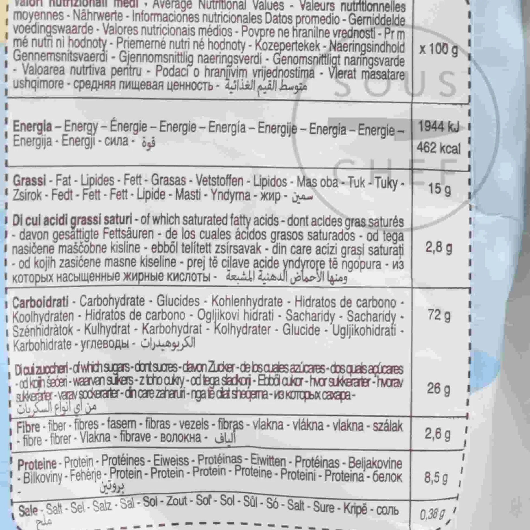 Product formulations and details may change. For the latest ingredients and allergen information always check product packaging prior to consumption. Ingredients: Wheat flour, sugar (of which sugar 1,3% for topping), sunflower oil 12%, cacao powder 4,0%, eggs, chocolate (sugar, cocoa mass, low fat cocoa powder, flavouring; cocoa min.48% ), butter, raising agents: sodium hydrogen carbonate, ammonium hydrogen carbonate, monopotassium tartrate, skim milk powder, hazelnut paste 0,3%, honey, salt, flavourings, powdered egg white, corn starch. *barn eggs