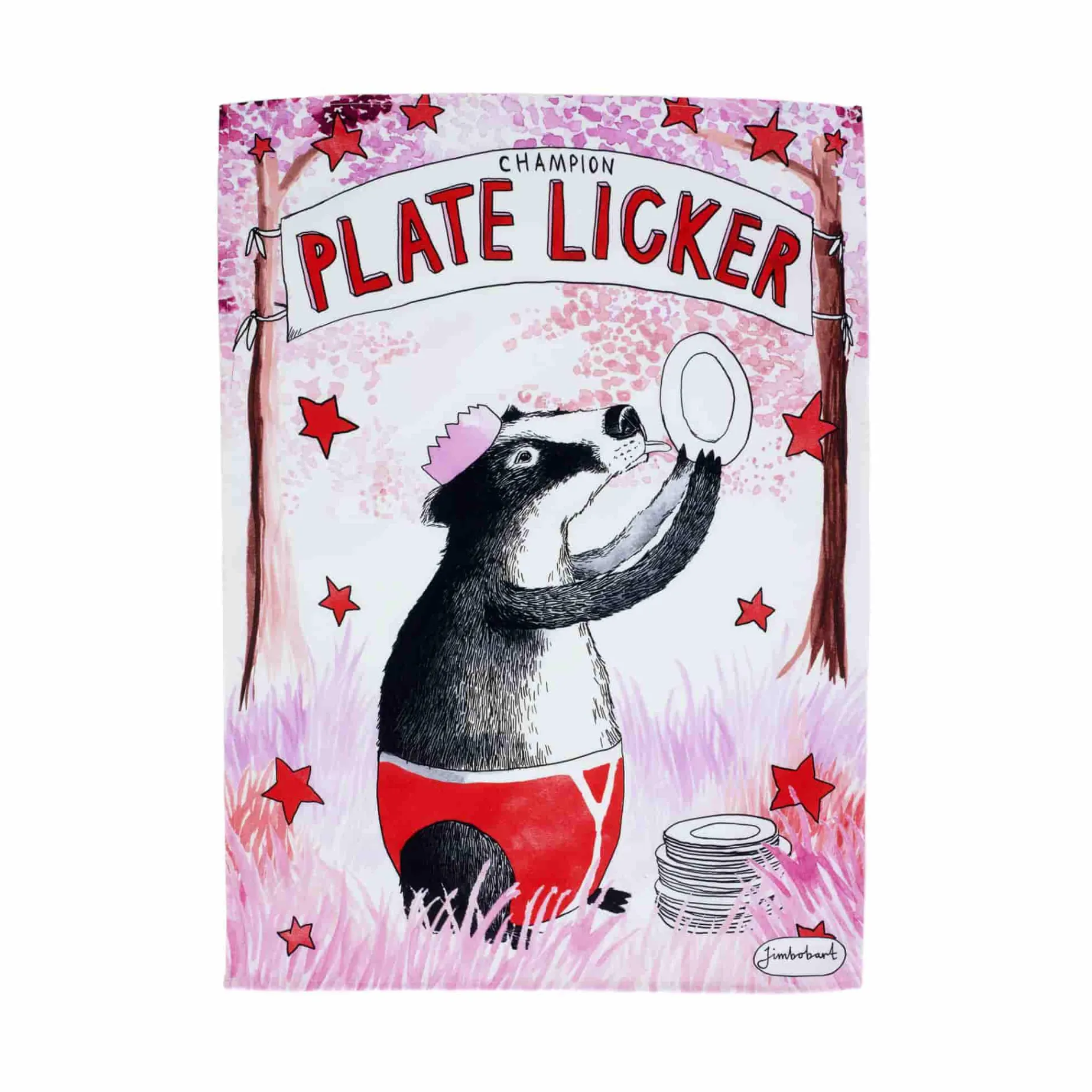 Jimbobart’s champion plate licker tea towel adds a playful touch to the kitchen chores. Made from 100% organic cotton and digitally printed in vibrant hues of pink and red, this tea towel dries dishes with ease and looks charming hanging by the sink. Decorated with a cheeky badger who prefers licking the plates to washing them, this kitchen furnishing will add a pop of colour to every space.