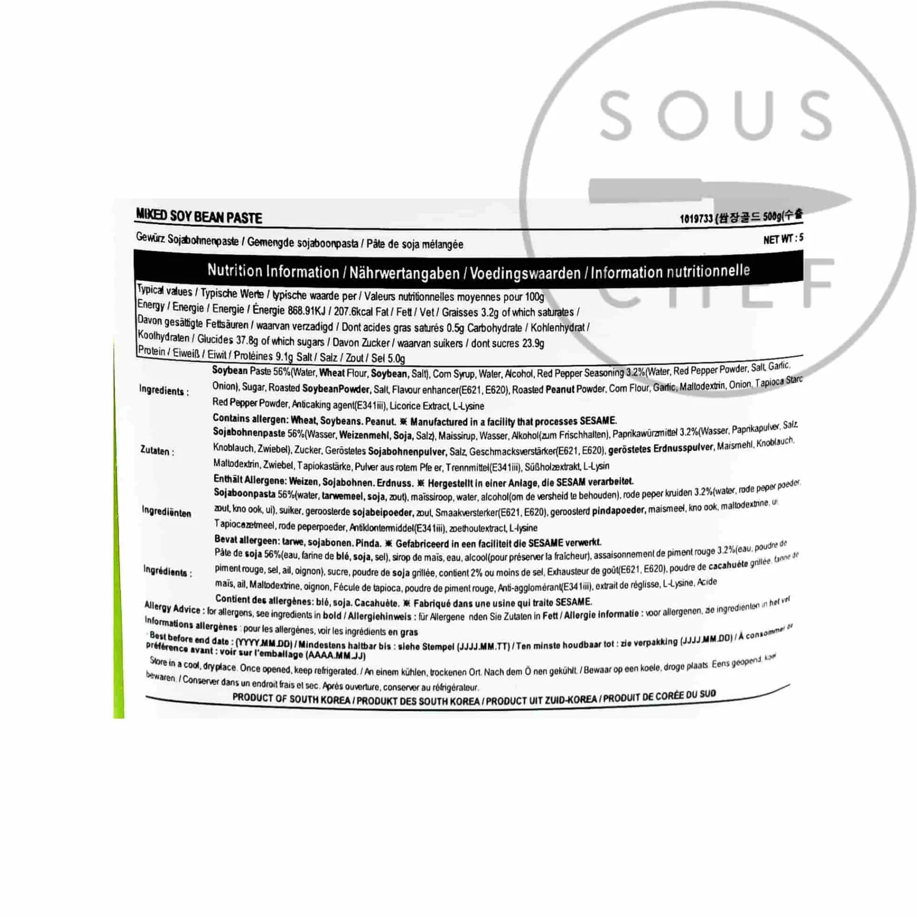 Product formulations and details may change. For the latest ingredients and allergen information always check product packaging prior to consumption. Ingredients: soybean paste 56% (water, wheat flour, soybean, salt), corn syrup, water, alcohol, red pepper seasoning 3.2% (water, red pepper powder, salt, garlic, onion), sugar, roasted soybean powder, salt, flavour enhancer (E621, E620), roasted peanut powder, corn flour, garlic, maltodextrin, onion, tapioca starch, red pepper powder, anticaking agent (E341iii, licorice extracts, L-lysine.