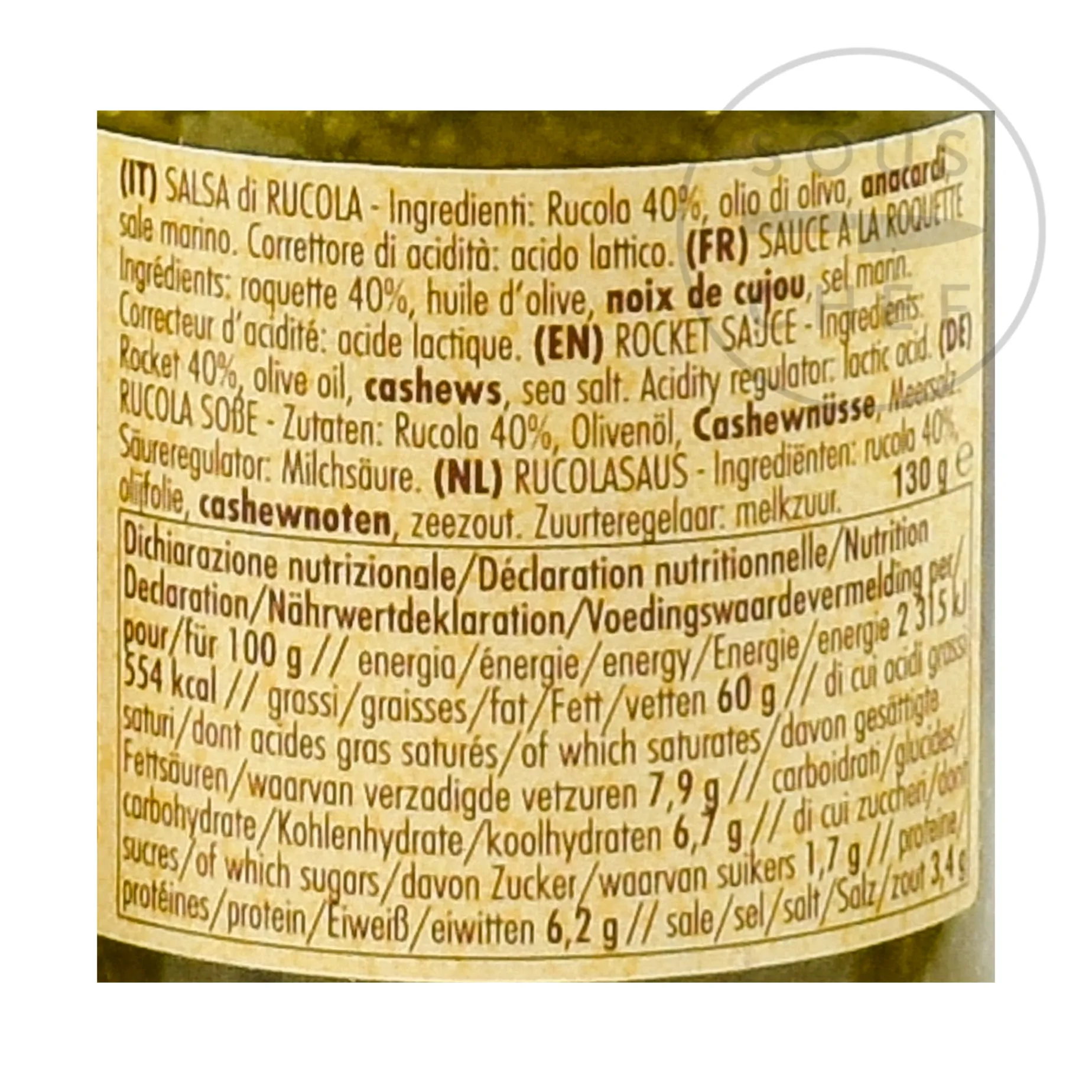 Product formulations and details may change. For the latest ingredients and allergen information always check product packaging prior to consumption. Ingredients: rocket (40%), olive oil, cashews, sea salt, acidity regulator: lactic acid. Contains allergens: nuts.