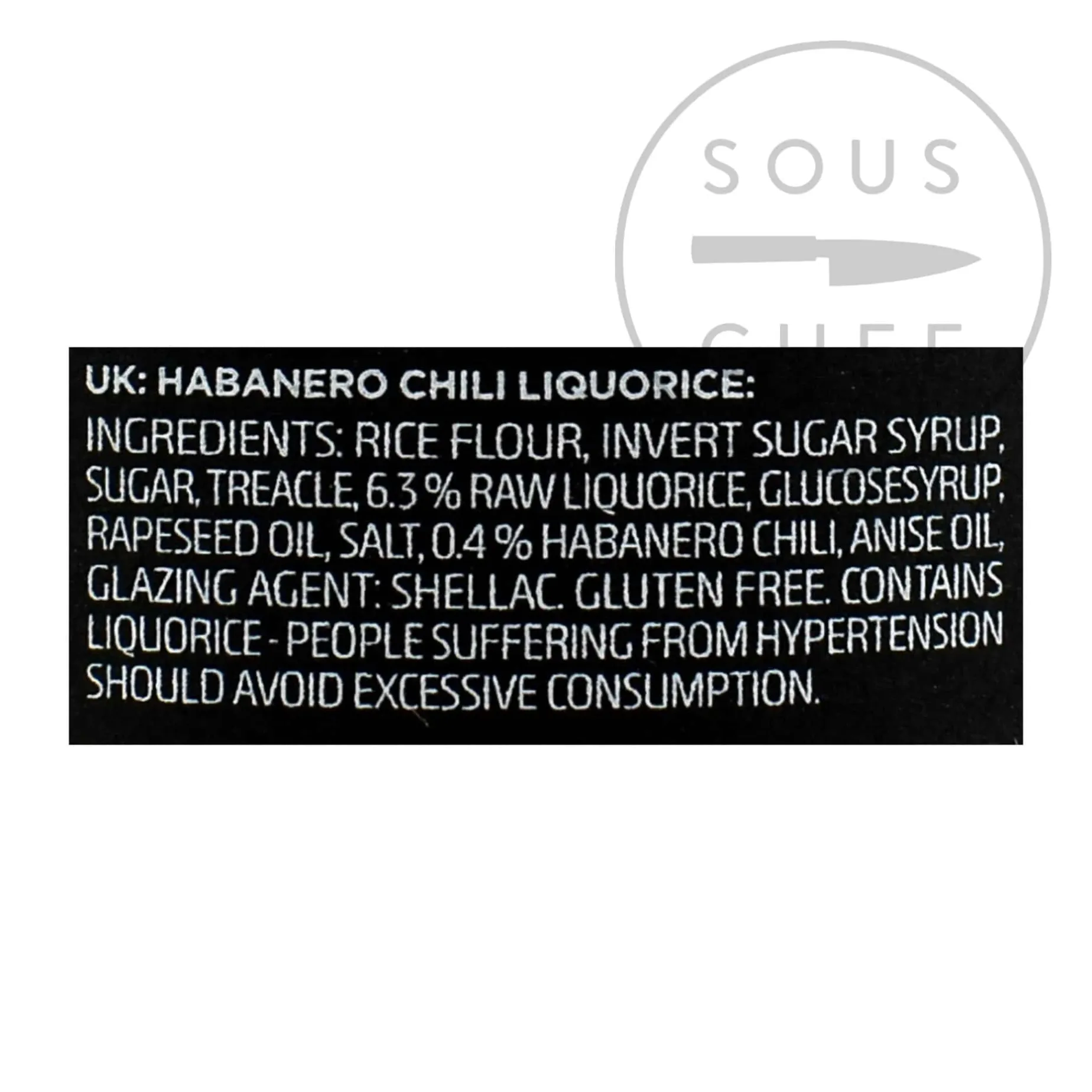 Product formulations and details may change. For the latest ingredients and allergen information always check product packaging prior to consumption. Ingredients: rice flour, invert sugar syrup, sugar, treacle, 6.3% raw liquorice, glucose syrup, rapeseed oil, salt, 0.4% habanero chilli, anise oil, glazing agent: shellac. Gluten free.