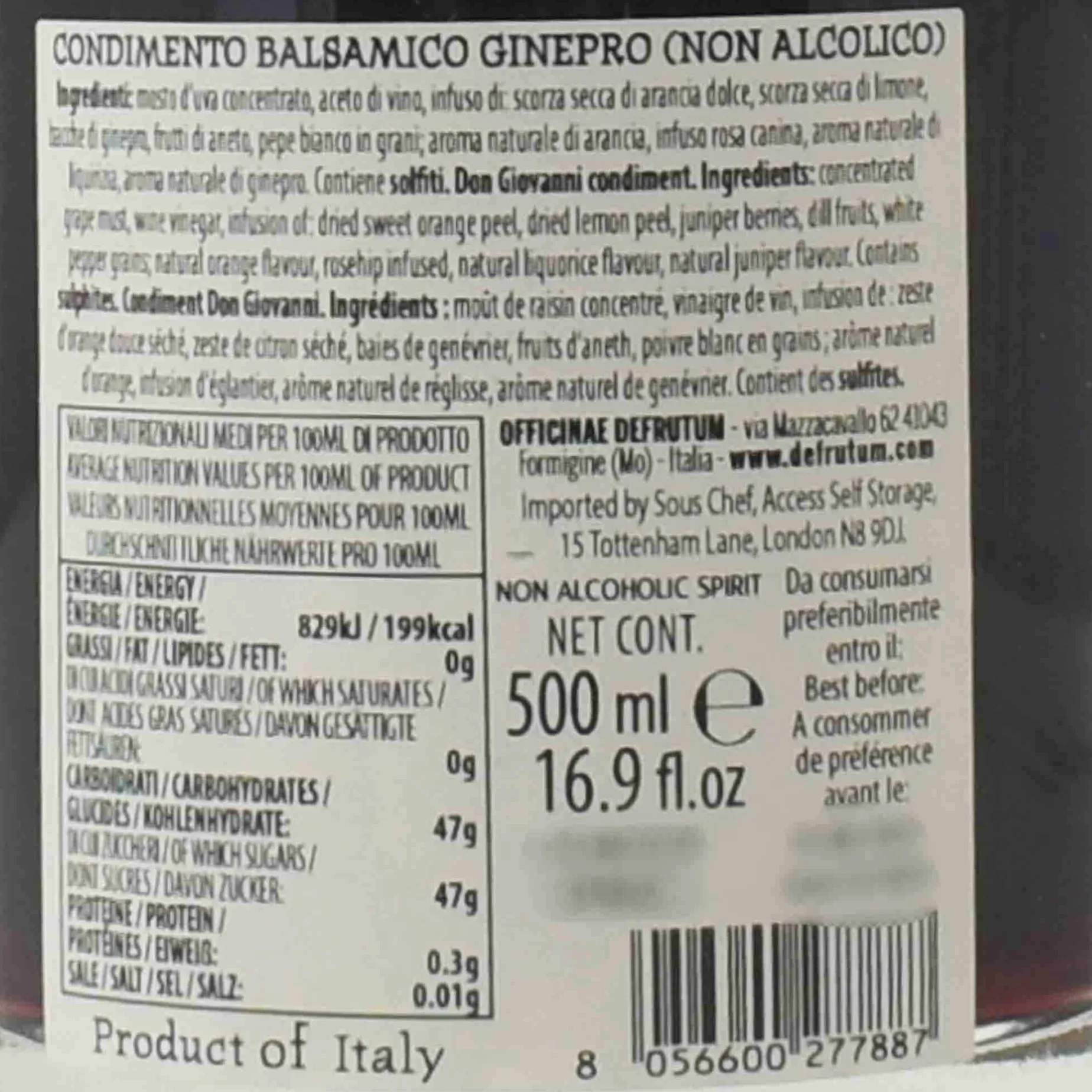 Product formulations and details may change. For the latest ingredients and allergen information always check product packaging prior to consumption. Ingredients: Concentrated grape must, wine vinegar, infusion of: dried sweet orange peel, dried lemon peel, juniper berries, dill fruits, white pepper grains; natural orange flavour, rosehip infused, natural liquorice flavour, natural juniper flavour. Contains sulfites.