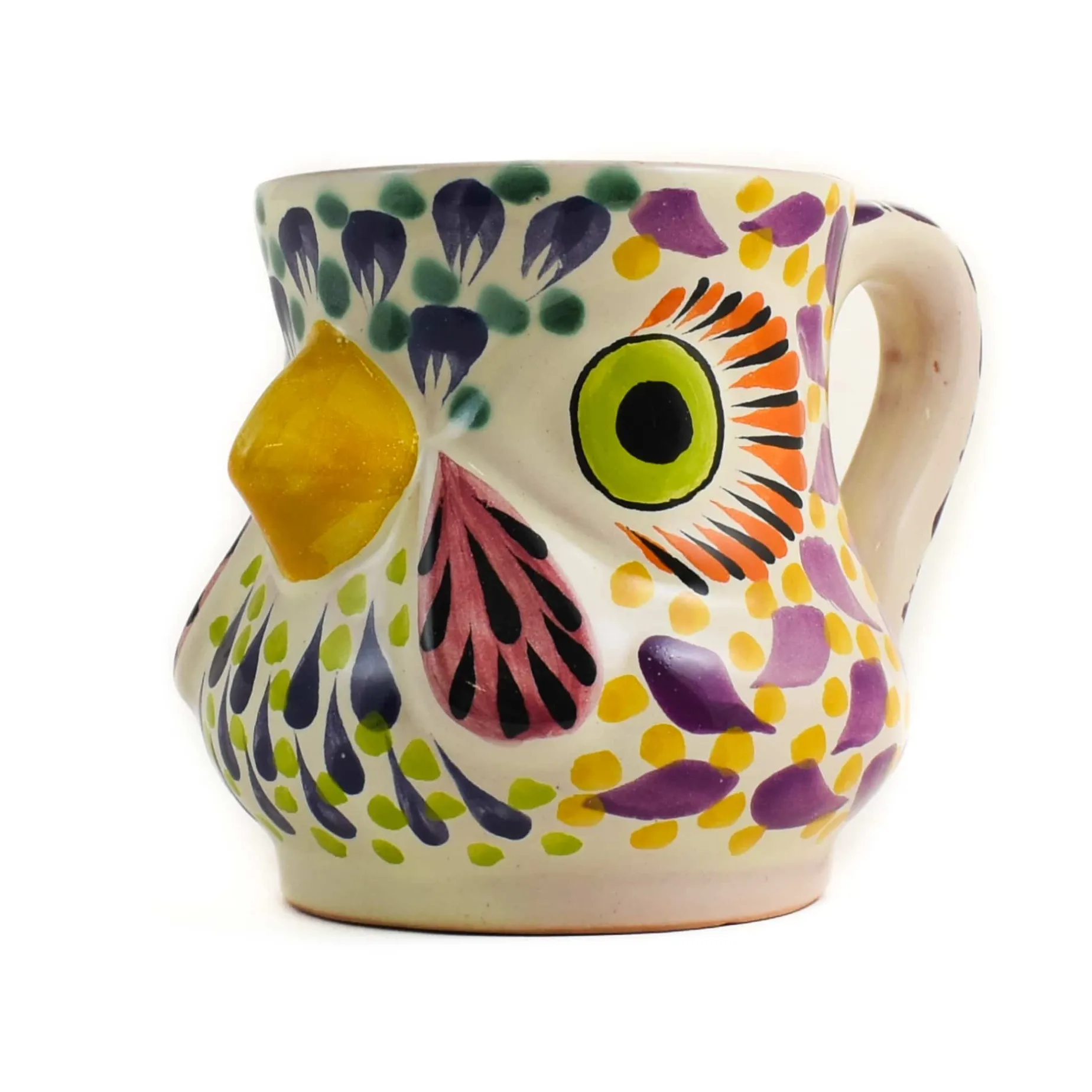 Brighten your day with this eye-catching rooster mug. Made in Mexico, it’s decorated in lively shades of orange, green and purple.