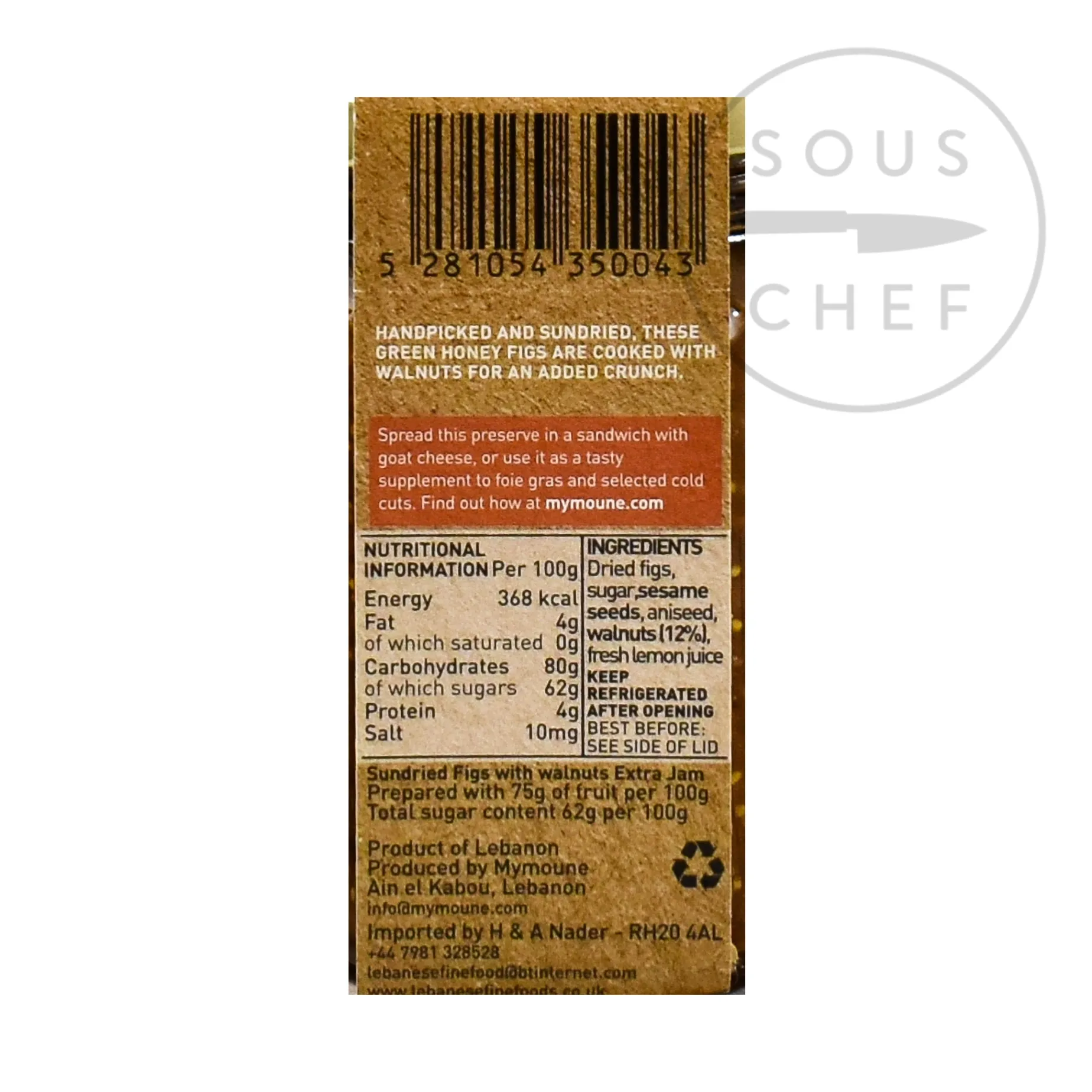 For a delicious fig jam that’s not too sweet, try Mymouné’s fig jam with walnuts – with a hint of aniseed for a mediterranean twist. Made with chunky dried figs and walnuts, this jam is a winner when served alone on toast, or even with cheese. This fig and walnut jam would also make a great combination with prosciutto ham – serve alongside goat’s cheese and peppery rocket for a twist on this classic Mediterranean starter.