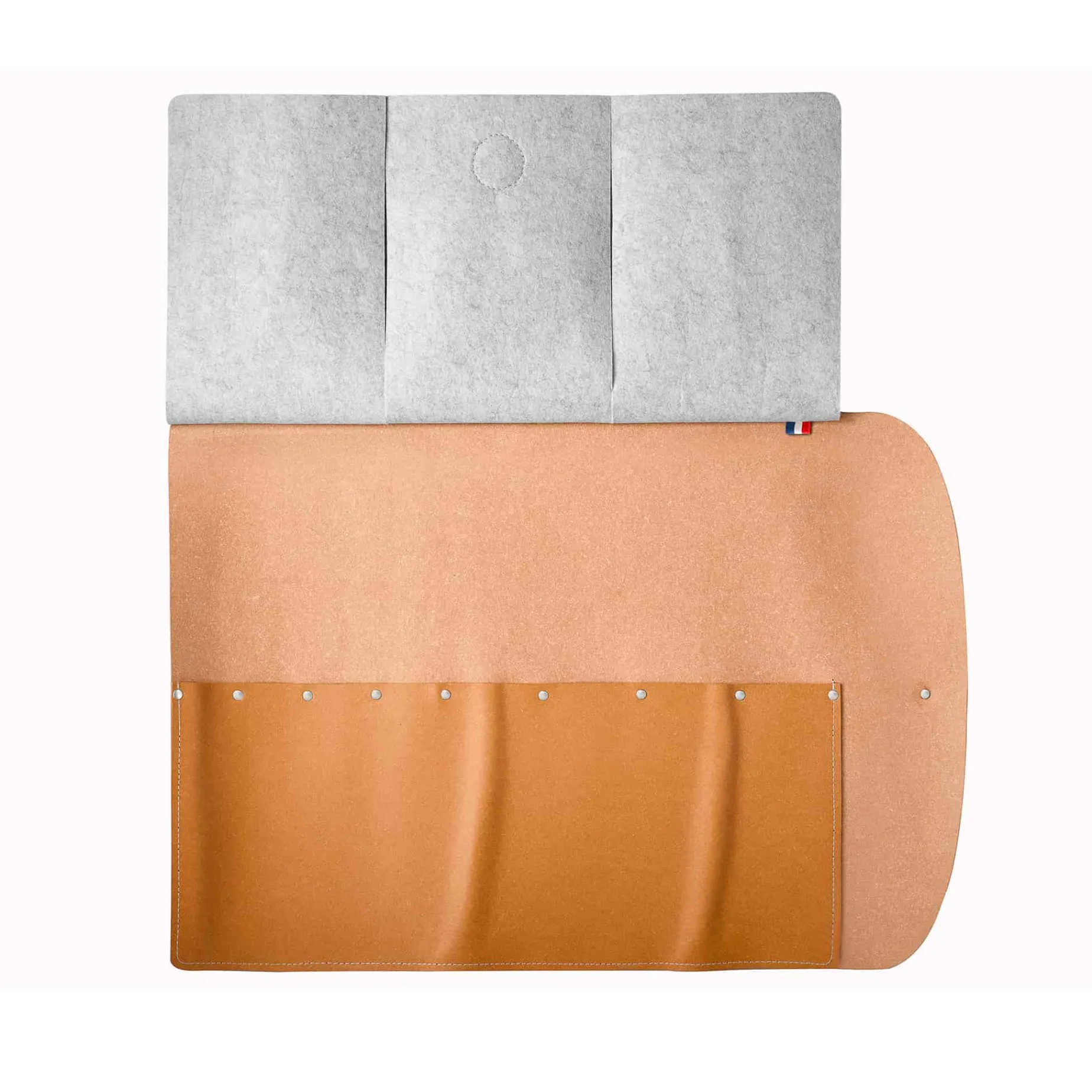 This knife roll is perfect for eco-conscious cooks. It’s made from recycled materials, including waste leather fibres. The roll is lined with felt made from recycled plastic bottles. The soft material prevents your blades from becoming dull or scratched.