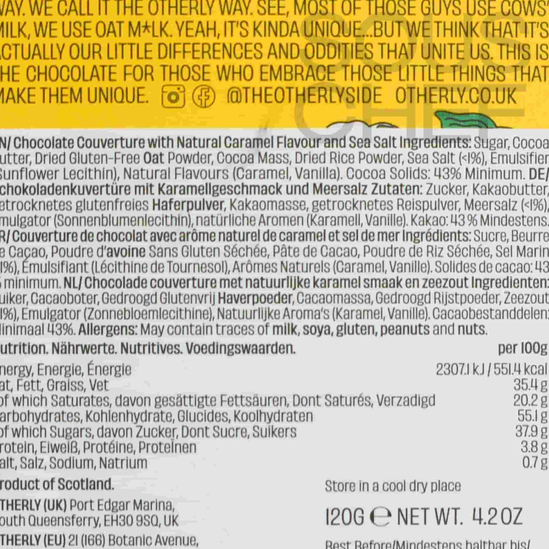Product formulations and details may change. For the latest ingredients and allergen information always check product packaging prior to consumption. Ingredients: Sugar, cocoa butter, dried gluten-free oat powder, cocoa mass, dried rice powder, sea salt (<1%), emulsifier (sunflower lecithin), natural flavours (caramel, vanilla). Cocoa Solids: 43% Minimum.