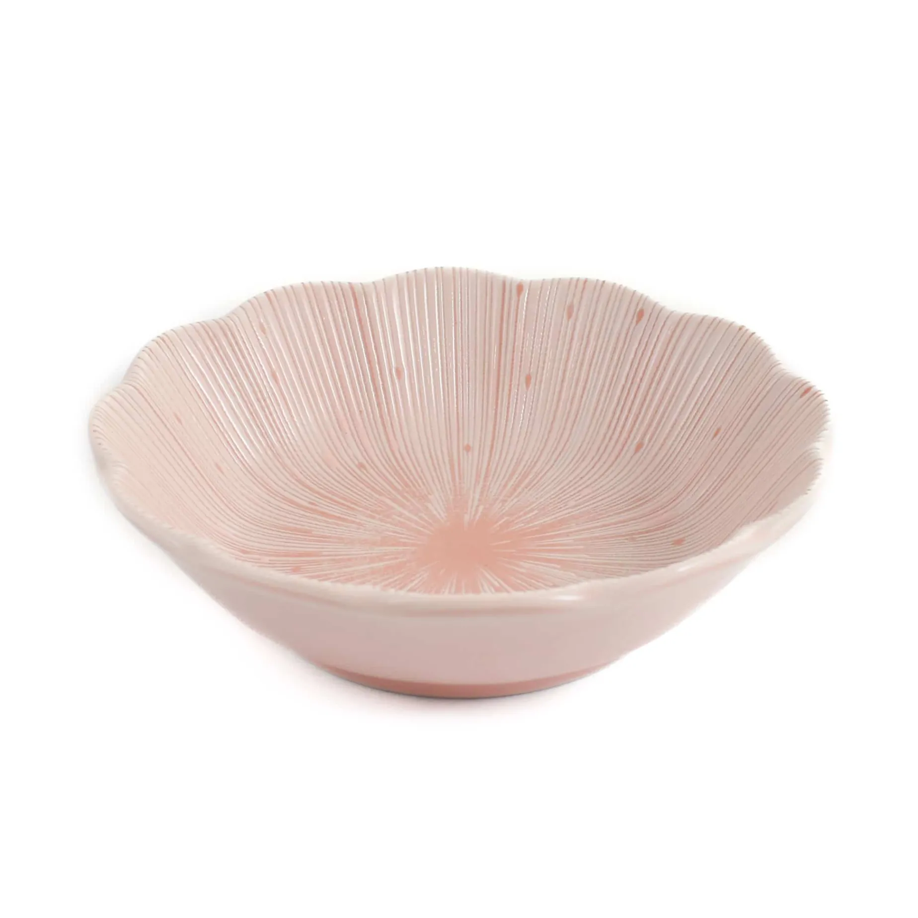 This pink scalloped bowl has a subtle, natural beauty. Made in Japan, it has fluted edges and a pale pink hue. The centre is a darker shade of pink, making it look like a delicate flower.