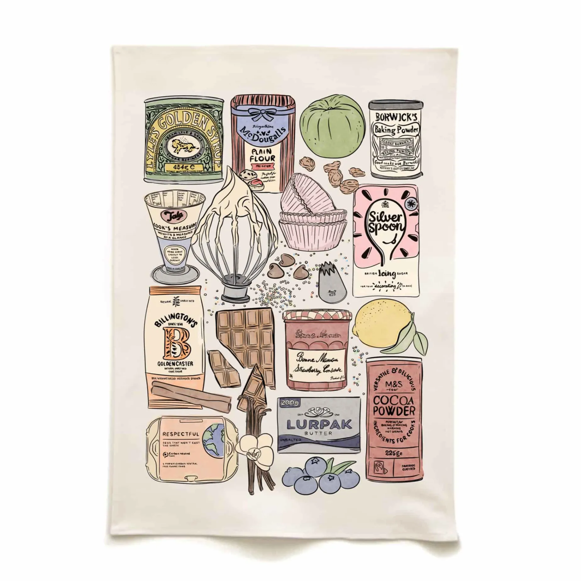 This tea towel is decorated with baking essentials. From plain flour to icing sugar, it has everything you need for home baking. The designs are hand-drawn and printed on organic cotton.
