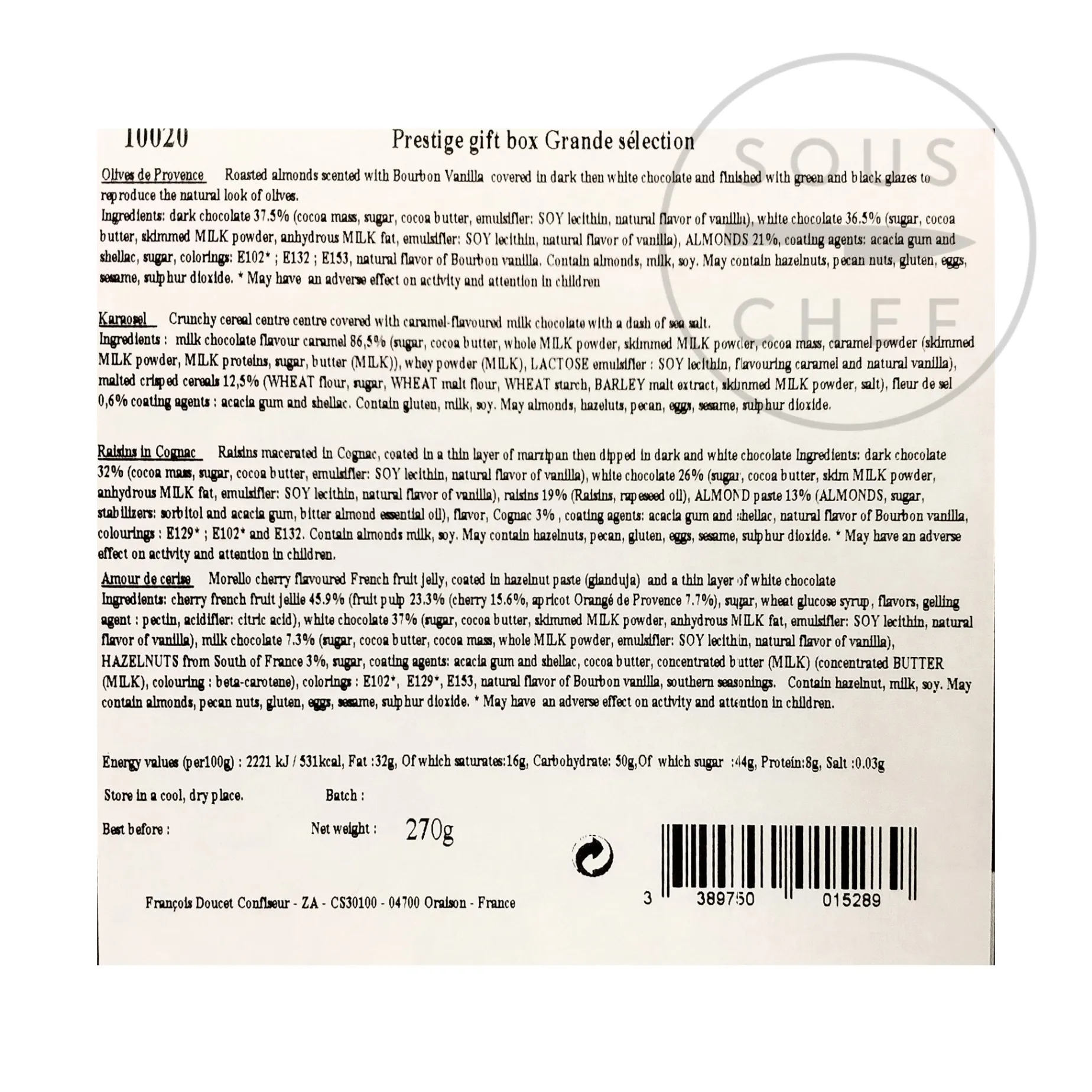 Product formulations and details may change. For the latest ingredients and allergen information always check product packaging prior to consumption. Ingredients: Olives of Provence: 37.5% Dark chocolate (cocoa paste, sugar, cocoa butter, emulsifier: soya lecithin, natural vanilla flavour), 36.5% white chocolate (sugar, cocoa butter, skimmed milk powder, anhydrous milk fat, emulsifier: soya lecithin, natural vanilla flavour), ALMONDS 21%, coating agents: acacia gum and shellac, sugar, colorants: E102 *; E132; E153, natural aroma of Bourbon vanilla. Cherry Love: 42.7% White chocolate (sugar, cocoa butter, skim milk powder, anhydrous milk fat, emulsifier: soya lecithin, natural vanilla flavour), cherry fruit paste 42.6% (fruit pulp 23 % (cherry 16%, apricot Orangé de Provence 7%), sugar, wheat glucose syrup, flavourings, gelling agent: pectin, acidifier: citric acid), milk chocolate 6.7% (sugar, cocoa butter, sugar paste) cocoa, MILK whole powder, emulsifier: soya lecithin, natural vanilla flavour), nuts from the South of France 3%, sugar, cocoa butter, coating agents: acacia gum and shellac, butter (milk) concentratedbutter (milk) concentrate, colouring: beta-carotene), colouring: E102 *, E129 *, E153, natural Bourbon vanilla flavour, Provence herbs .Cognac Grapes: 32% Dark chocolate (cocoa mass, sugar, cocoa butter, emulsifier: soya lecithin, natural vanilla flavour), 26% white chocolate (sugar, cocoa butter, skimmed milk powder, anhydrous milk fat, emulsifier: soya lecithin, natural vanilla flavour), raisins 19% (grapes, rapeseed oil), almond paste 13% (almonds, sugar, stabilizers: sorbitol and acacia gum, bitter almond essential oil ), aroma, Cognac 3%, coating agents: acacia gum and shellac, natural Bourbon vanilla flavour, colors: E129 *; E102 *; E132.Karaosel: caramel flavoured milk chocolate 86.5% (sugar, cocoa butter, skimmed milk powder, cocoa mass, caramel powder (milk skimmed powder, milk protein, sugar, butter (milk )), whey in powder (milk ), lactose, emulsifier: soya lecithin, caramel flavour and natural vanilla), crumbly malted cereals 12.5% (BLE flour, sugar, malted wheat flour, BLE starch, barley malt extract, skim milk, salt), fleur de sel 0.6%, coating agents: acacia gum and shellac.