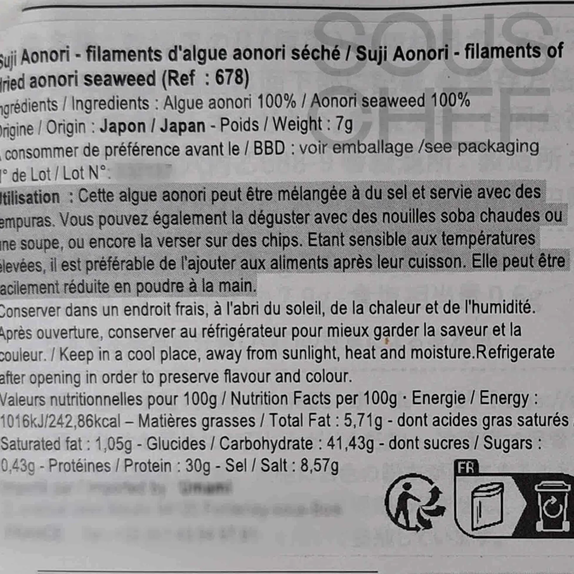 Rich in minerals, aonori seaweed has a distinctive salty flavour. You may also detect a hint of truffle. The seaweed is grown on land using seawater and then dried to preserve its freshness.