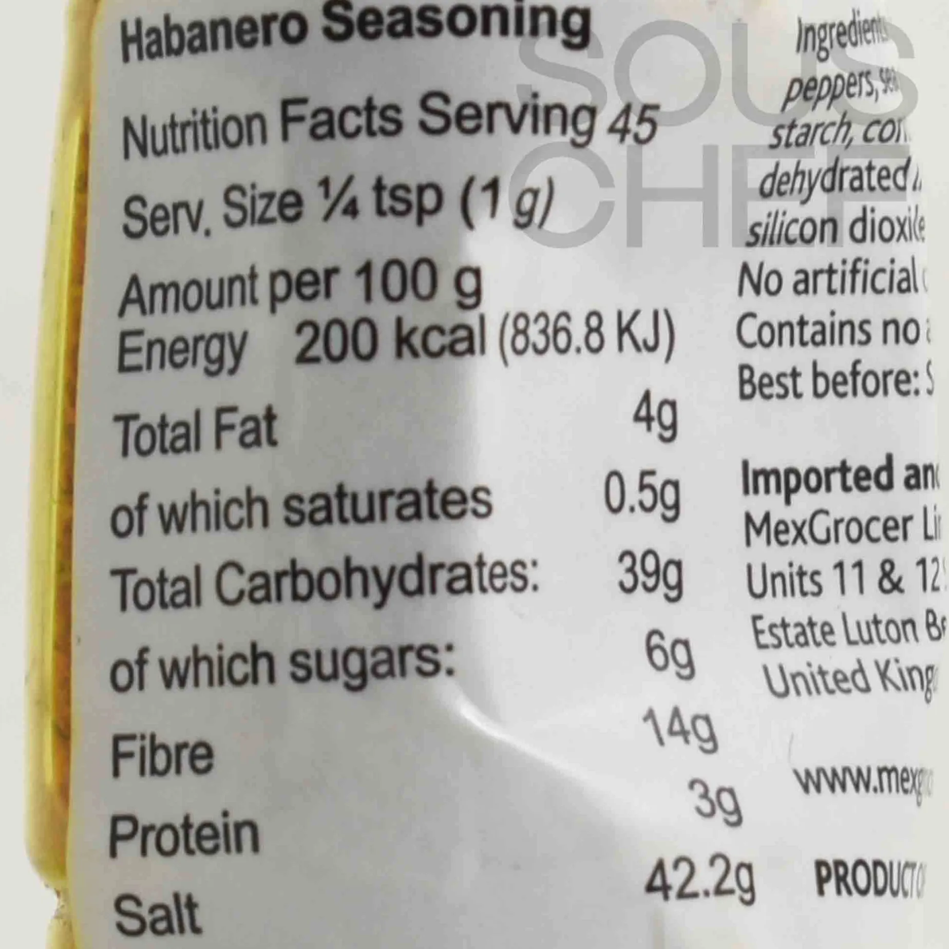 Product formulations and details may change. For the latest ingredients and allergen information always check product packaging prior to consumption. Ingredients: Habanero peppers, chili peppers, citric acid, acetic acid, starch, contains 0,5% or less of dehydrated lime juice, turmeric, silicon dioxide (to prevent caking)
