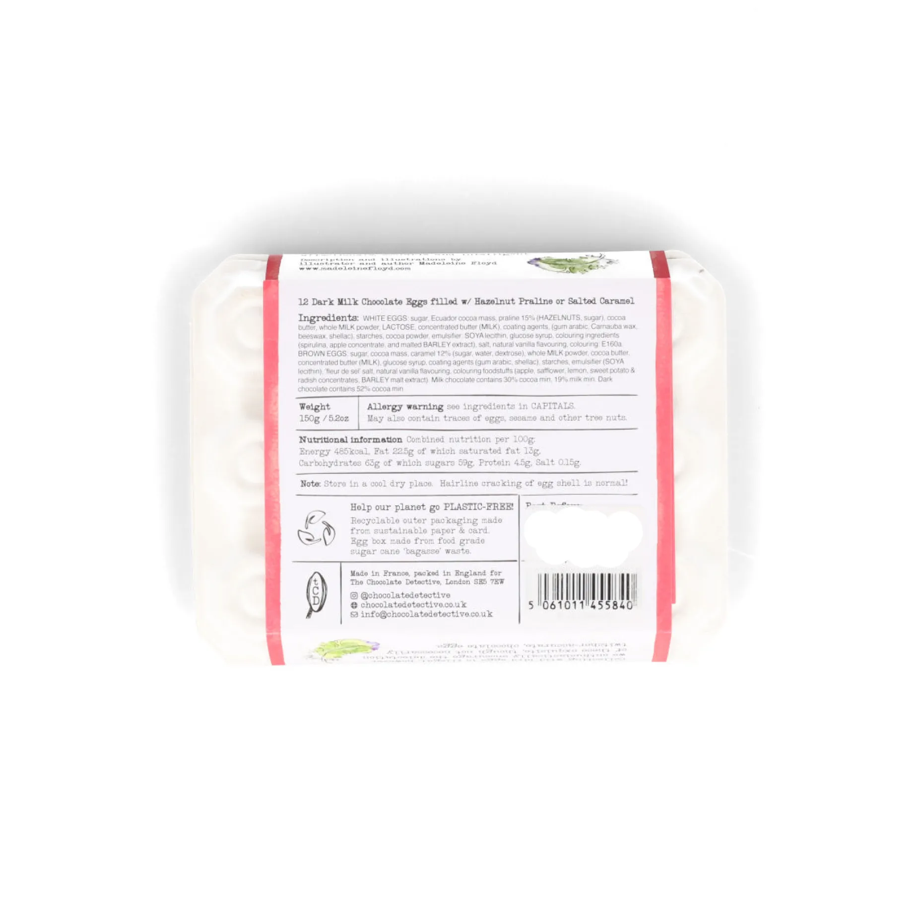 Six eggs are filled with smooth salted caramel. The rest are filled with a rich hazelnut praline.