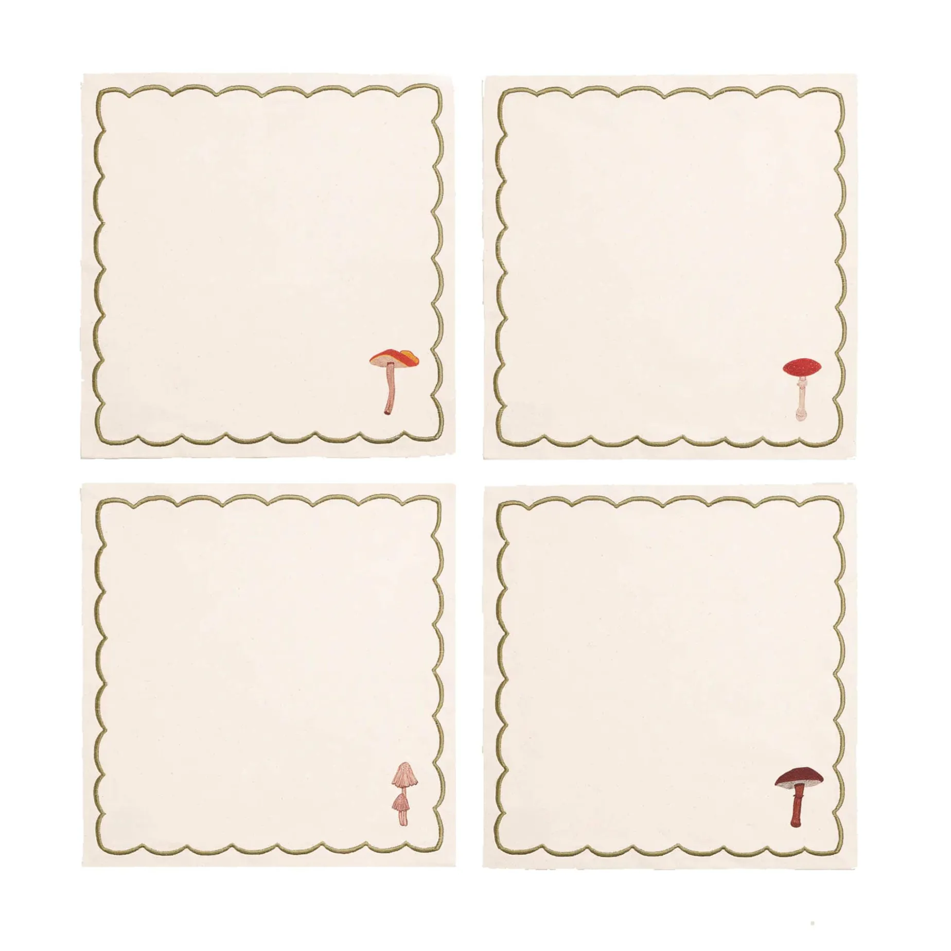 This set of four mushroom design linen napkins will add a touch of autumnal elegance to your table. Printed on high quality linen, each napkin features a different mushroom design and a wavy embroidered border. Each mushroom has its own unique shape and colour, ranging from earthy browns to pale pinks and robust reds. The designs have a delicate, playful appeal – perfect for long, leisurely lunches with friends.