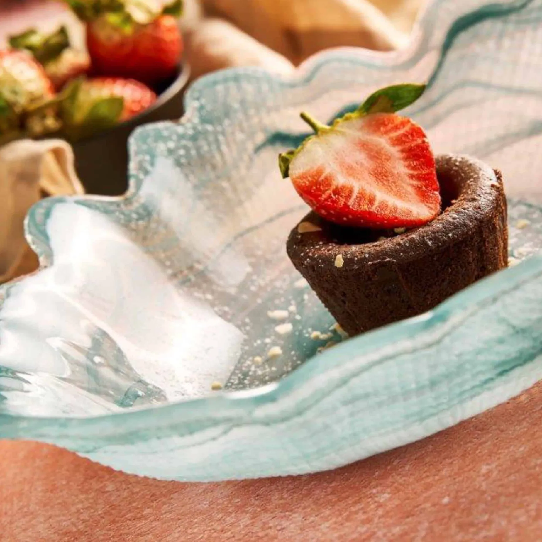 The bowl’s turquoise hue and wavy edges look striking against a white tablecloth. Fill it with freshly baked rolls, salads or candies to enjoy after dinner.