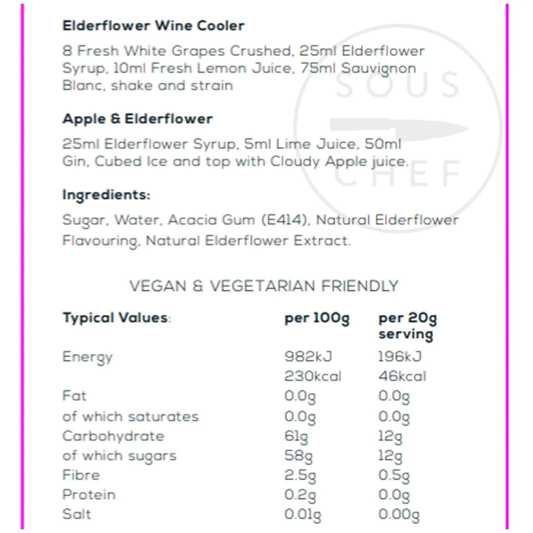 Product formulations and details may change. For the latest ingredients and allergen information always check product packaging prior to consumption. Ingredients: Sugar, water, emulsifier: acacia gum (E414), flavourings: natural elderflower flavouring