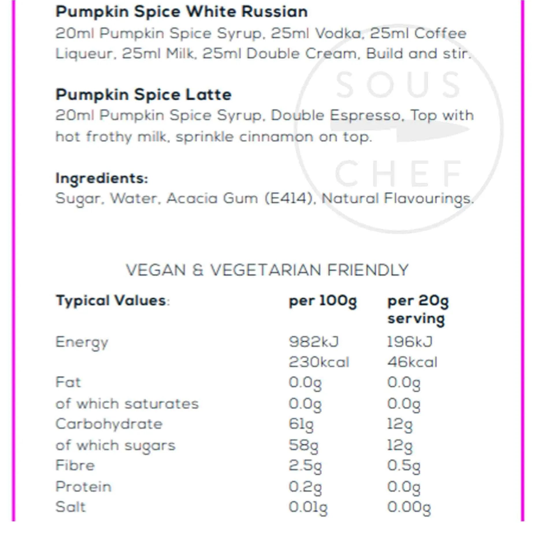 Product formulations and details may change. For the latest ingredients and allergen information always check product packaging prior to consumption. Ingredients: Sugar, water, emulsifier: acacia gum (E414), flavourings: natural pumpkin, cinnamon and clove flavouring