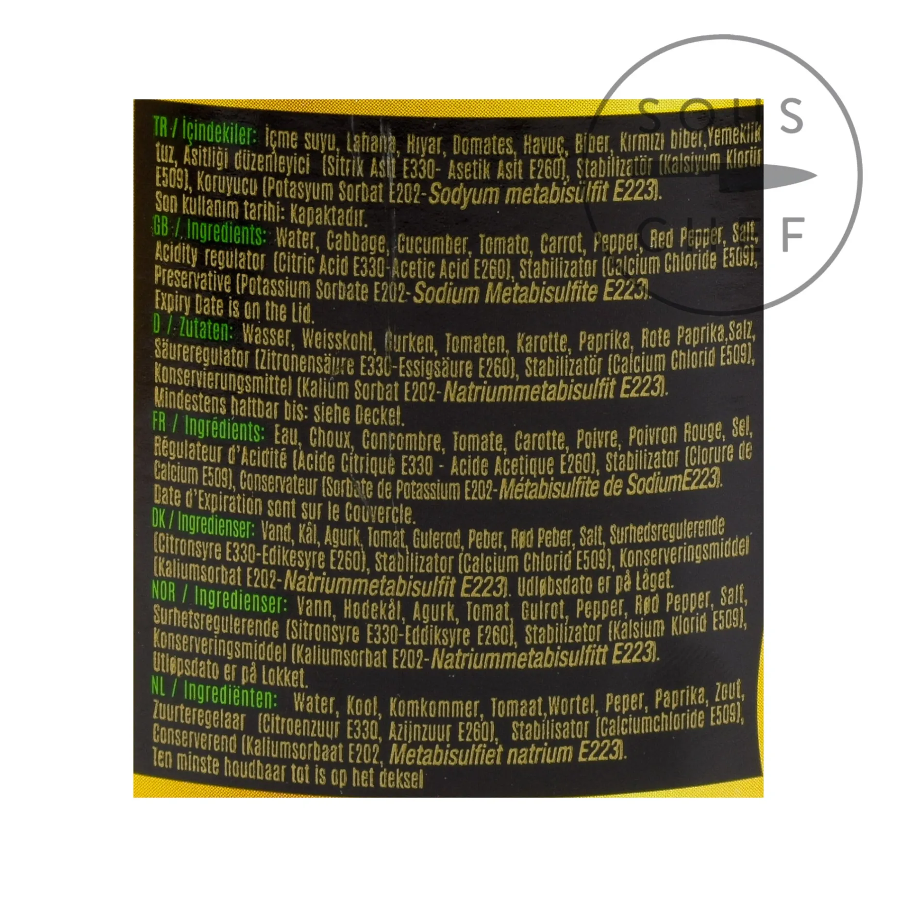 Product formulations and details may change. For the latest ingredients and allergen information always check product packaging prior to consumption. Ingredients: Water, cabbage, cucumber, tomato, carrot, pepper, red pepper, salt, acidity regulator (citric acid E330, acetic acid E260), stabilizer (calcium chloride E509), preservative (potassium sorbate E202, sodium metabisulfite E223).