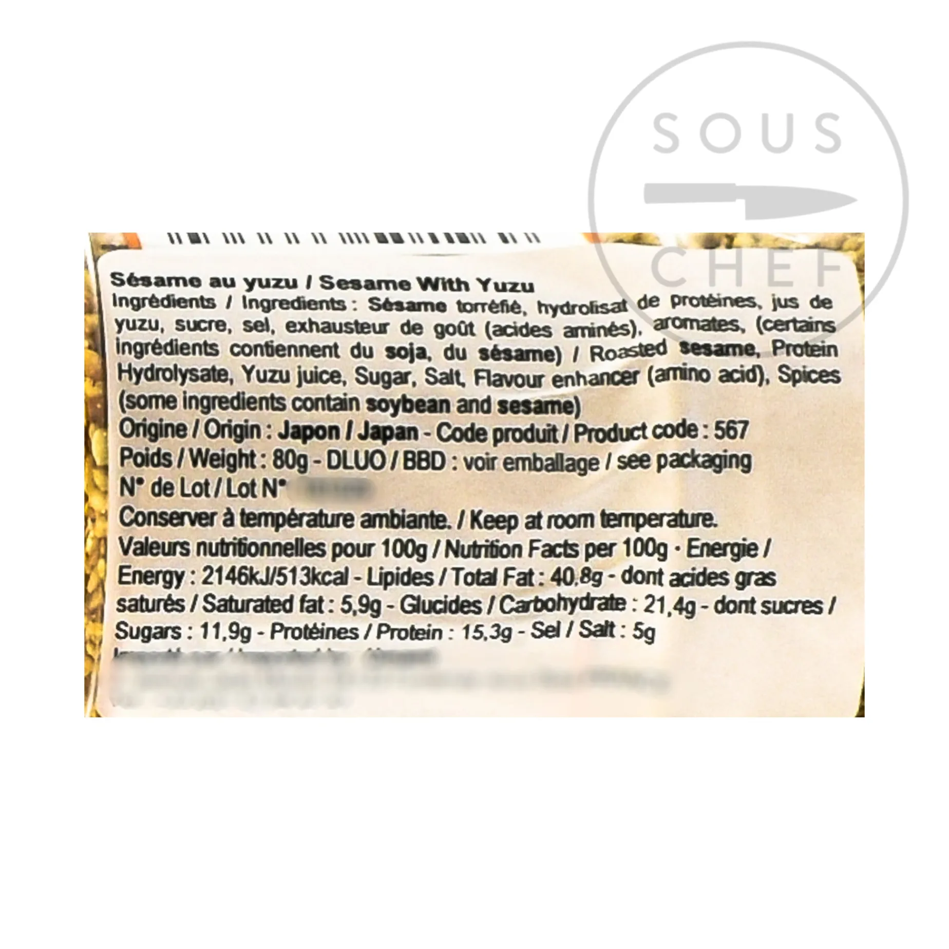 Product formulations and details may change. For the latest ingredients and allergen information always check product packaging prior to consumption. Ingredients: roasted sesame, protein hydrolysate, yuzu juice, sugar, salt, flavour enhancer (amino acid), spices. Contains allergens: sesame, soya.