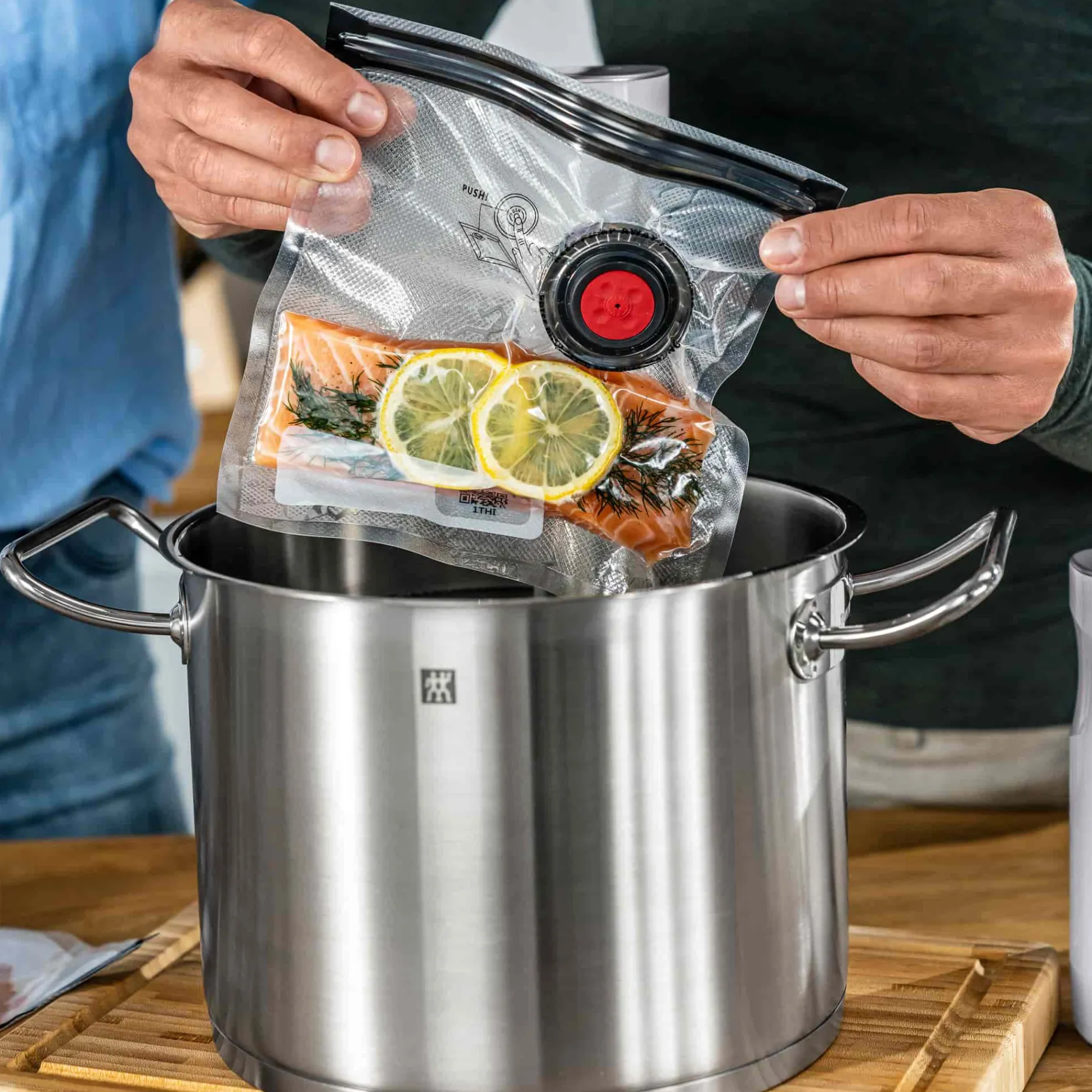 Available in two sizes, the airtight bags have a zipper closure. They can be used for freezing, marinating and sous vide cooking. To use them in a water bath, attach a vacuum pump and remove air from the bag in seconds. The bag is now sealed and can be placed in water.
