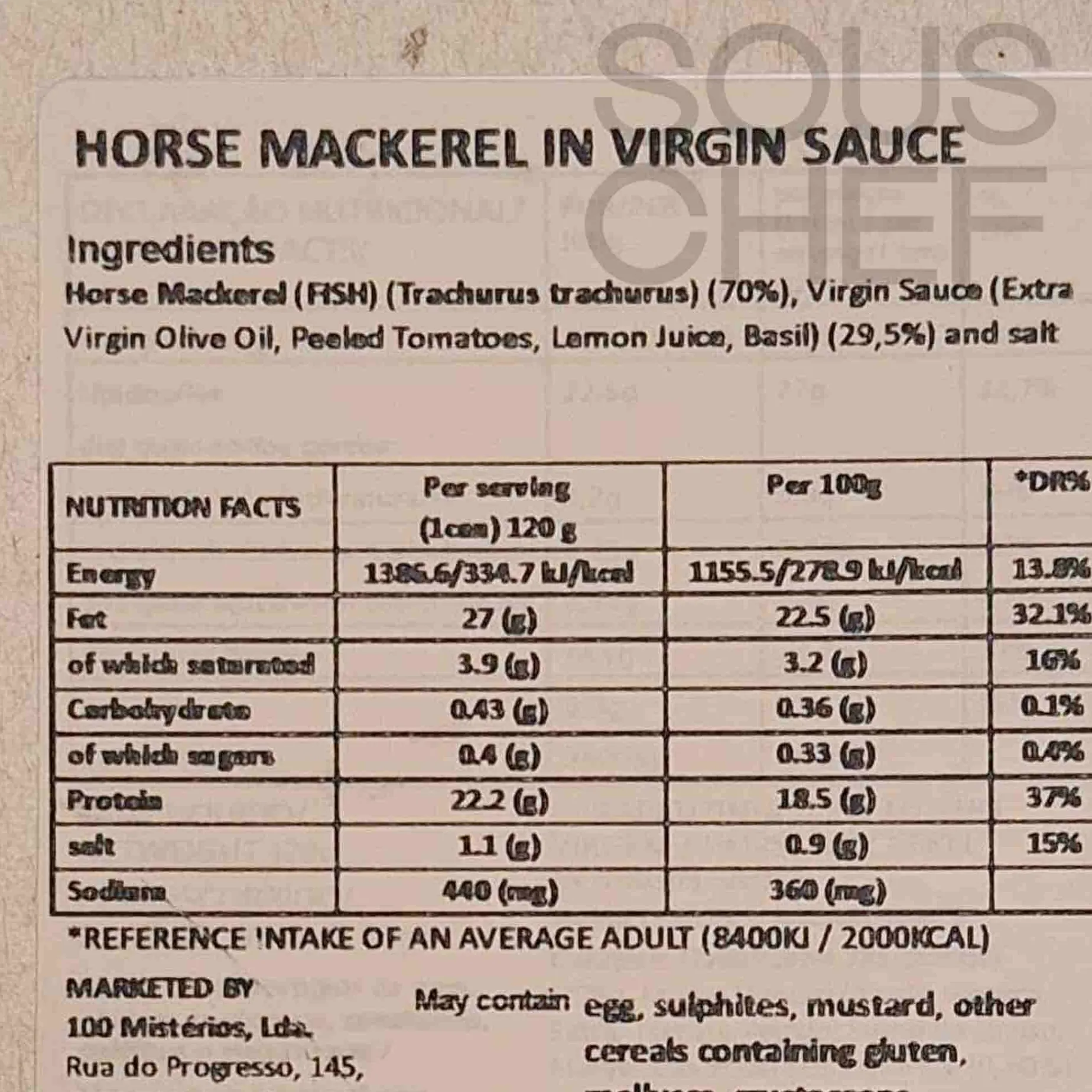 Product formulations and details may change. For the latest ingredients and allergen information always check product packaging prior to consumption. Ingredients: Horse mackerel (trachurus trachurus) (fish) virgem sauce (extra virgin olive oil, peeled tomatoes, lemon juice, basil), salt