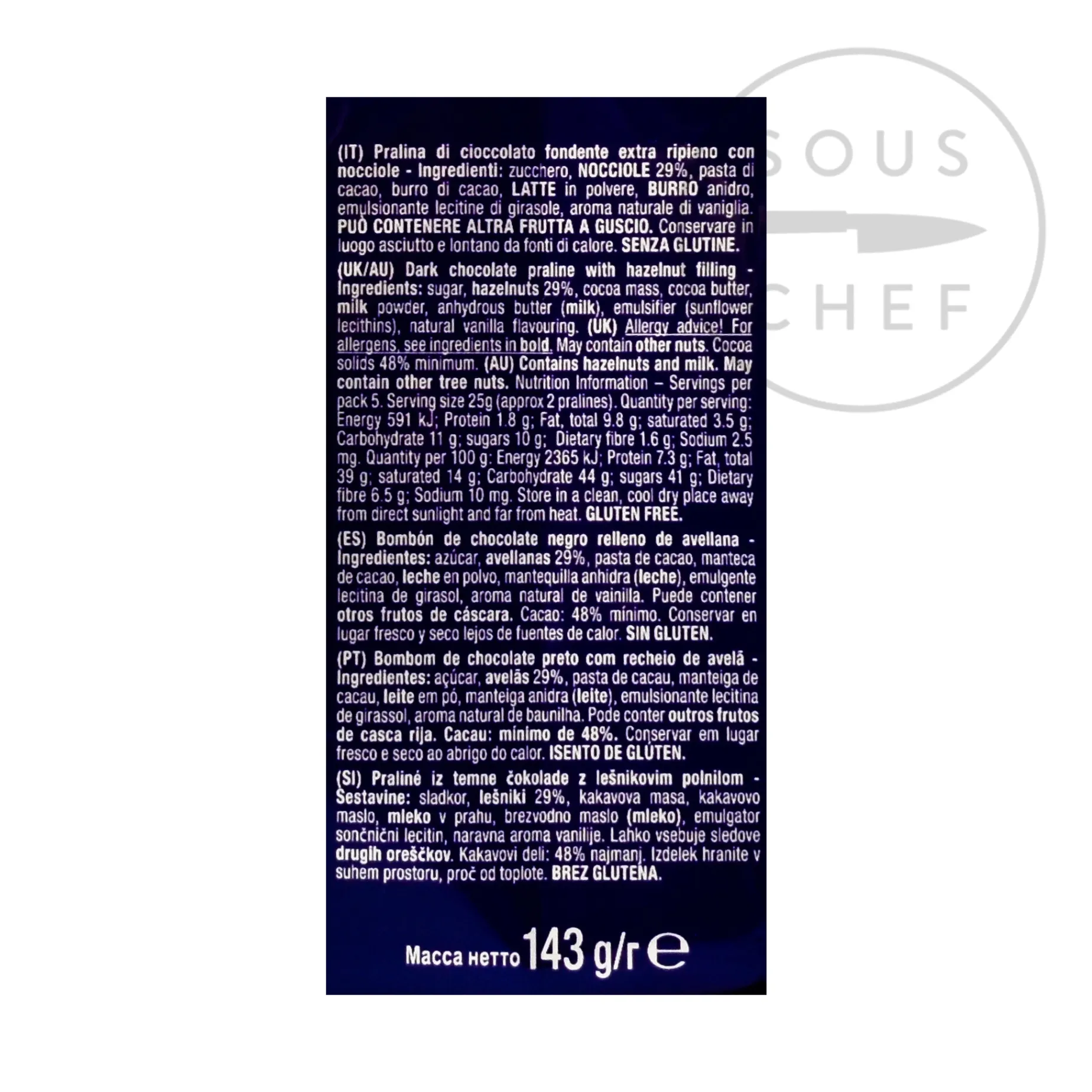 Dark chocolates: sugar, hazelnuts (29%), cocoa mass, cocoa butter, milk powder, anhydrous butter (milk), emulsifier (lecithins), natural vanilla flavouring. Allergens are listed in bold. May contain traces of other nuts. Gluten free. Cocoa solids: 48% minimum.