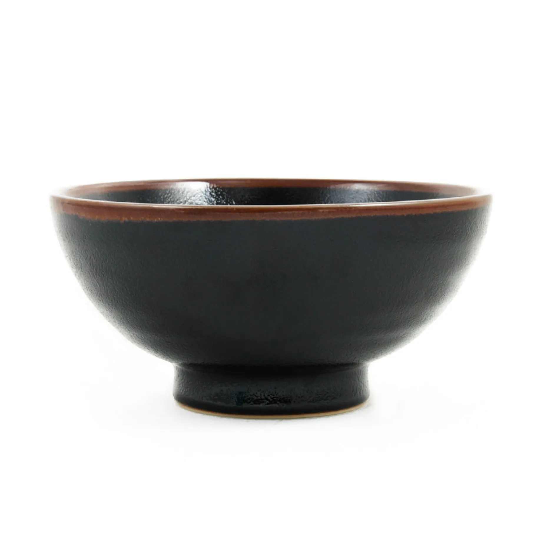 This black stoneware ramen bowl with a dimpled texture and brown rim makes for an attractive piece of tableware. The black glaze creates a dramatic background, working particularly well against both light food, such as rice dishes or chowders, and brightly-coloured soups or fresh salads.