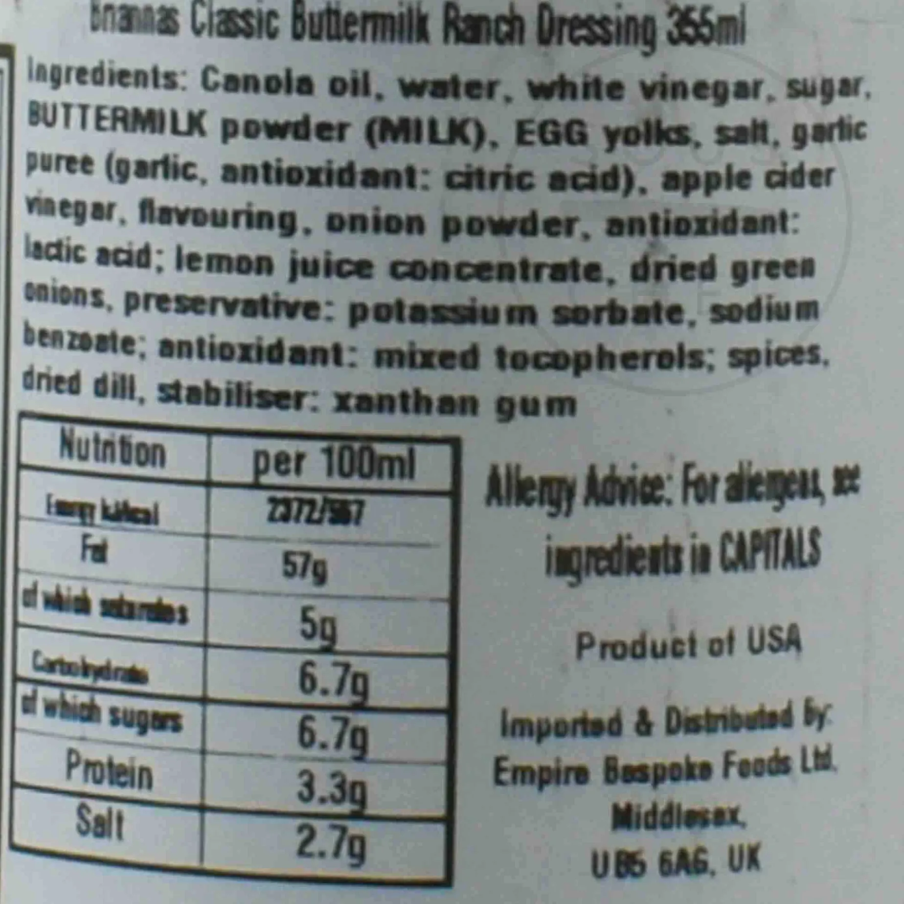 Product formulations and details may change. For the latest ingredients and allergen information always check product packaging prior to consumption. Ingredients: Canola oil, water, white vinegar, sugar, buttermilk powder (milk), egg yolks, salt, garlic puree (garlic, antioxidant: citric acid), apple cider vinegar, flavouring, onion powder, antioxidant: lactic acid; lemon juice concentrate, dried green onion, preservative: potassium sorbate, sodium benzoate; antioxidant: mixed tocopherols; spices, dried dill, stabiliser: xanthan gum