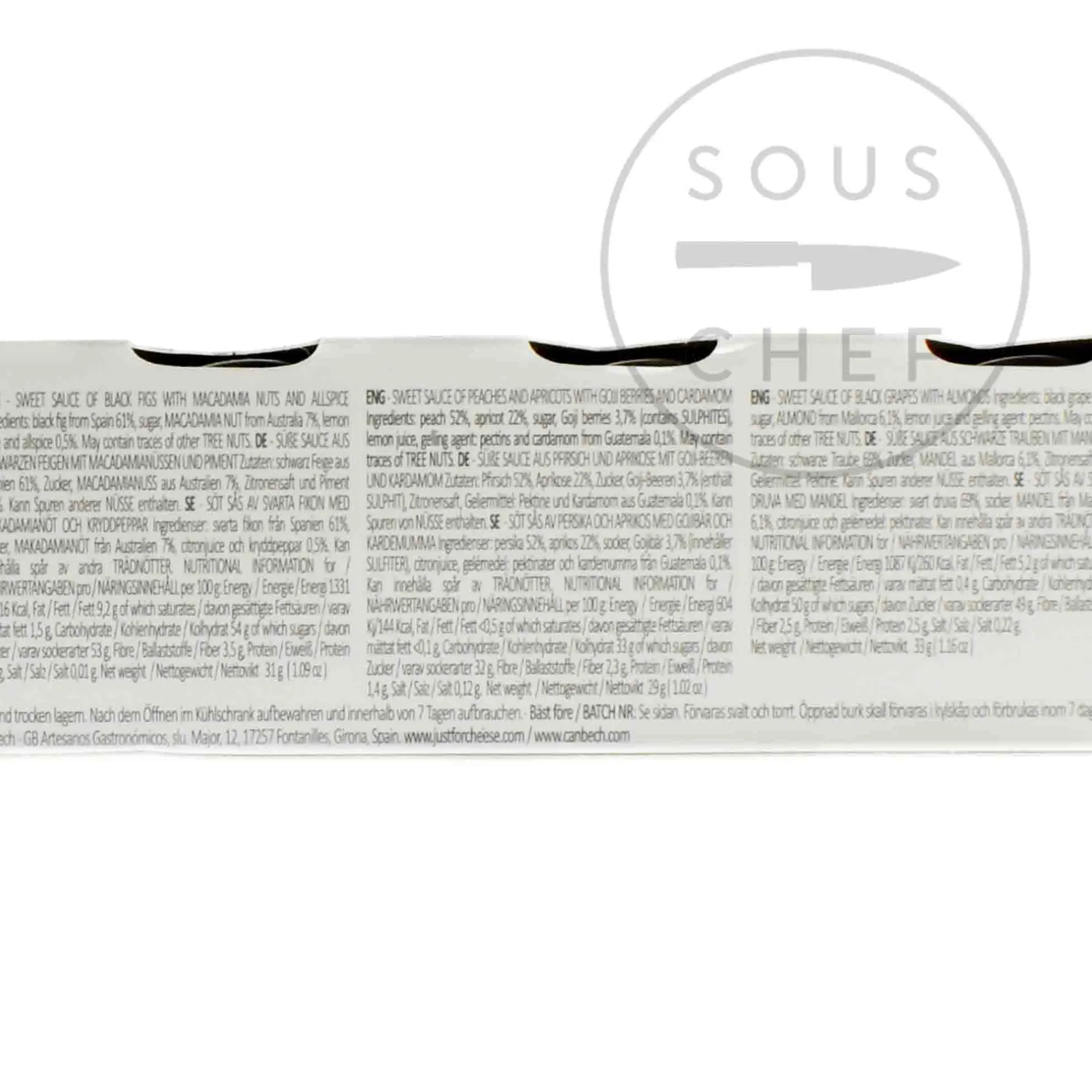 Product formulations and details may change. For the latest ingredients and allergen information always check product packaging prior to consumption. Ingredients: Raspberries: sugar, water, lemon juice, raspberries 2,4%, gelling: pectins, rose petals 0,6%, Szechuan pepper 0.05% and natural rose aroma. Black figs: black figs 61%, sugar, Australian macadamia nuts 12%, lemon juice and Jamaican allspice 0.5%. Grape: black grapes 69%, sugar, majorcan almonds 6,1%, lemon juice and gelling: pectins. Peach and apricot: peach 52%, apricot 22%, sugar, goji berries 3,7% (contains sulphites), lemon juice, gelling: pectins, and Guatemalan cardamom 0.1%. Apple: golden apples 65%, sugar, tender pistachios from Turkey 6,5%, lemon juice, Sri Lankan cinnamon 0.3% and gelling: pectins.