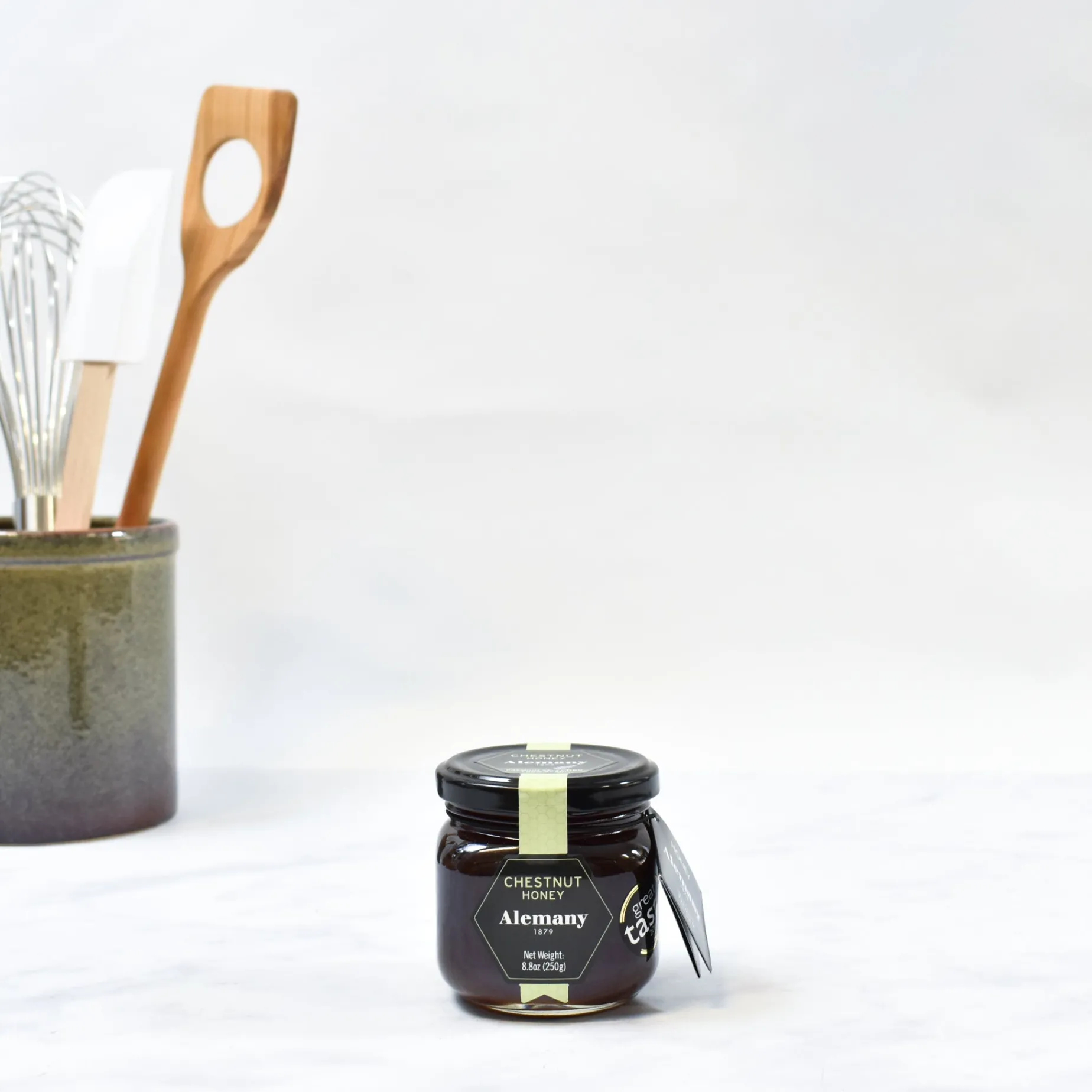 Chestnut honey is a dark, treacle-brown honey with bitter-sweet, almost savoury flavours. It has complex, rich, smoky aromas with a rich, nutty taste and long finish.
