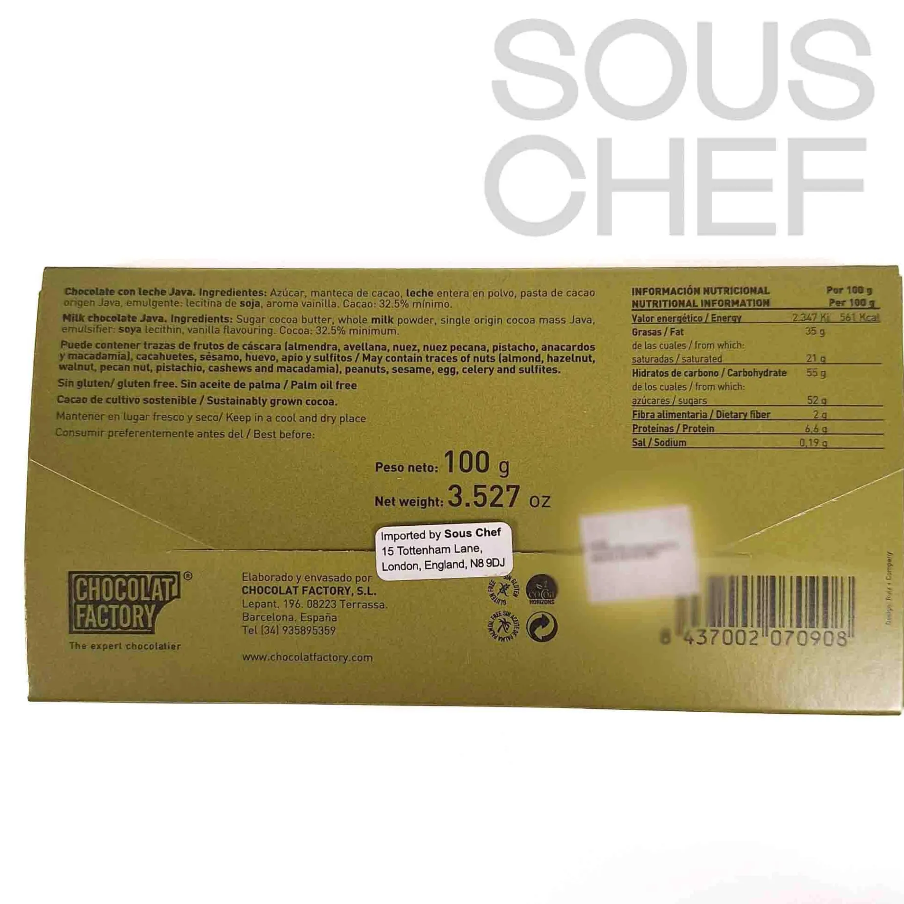 This milk chocolate bar is made by Spanish chocolate experts, Chocolat Factory. The beans are grown and harvested in Java, Indonesia. It has the sweet, creamy taste you expect from milk chocolate with a refreshing hint of acidity. You can also expect notes of caramel and yellow fruit.