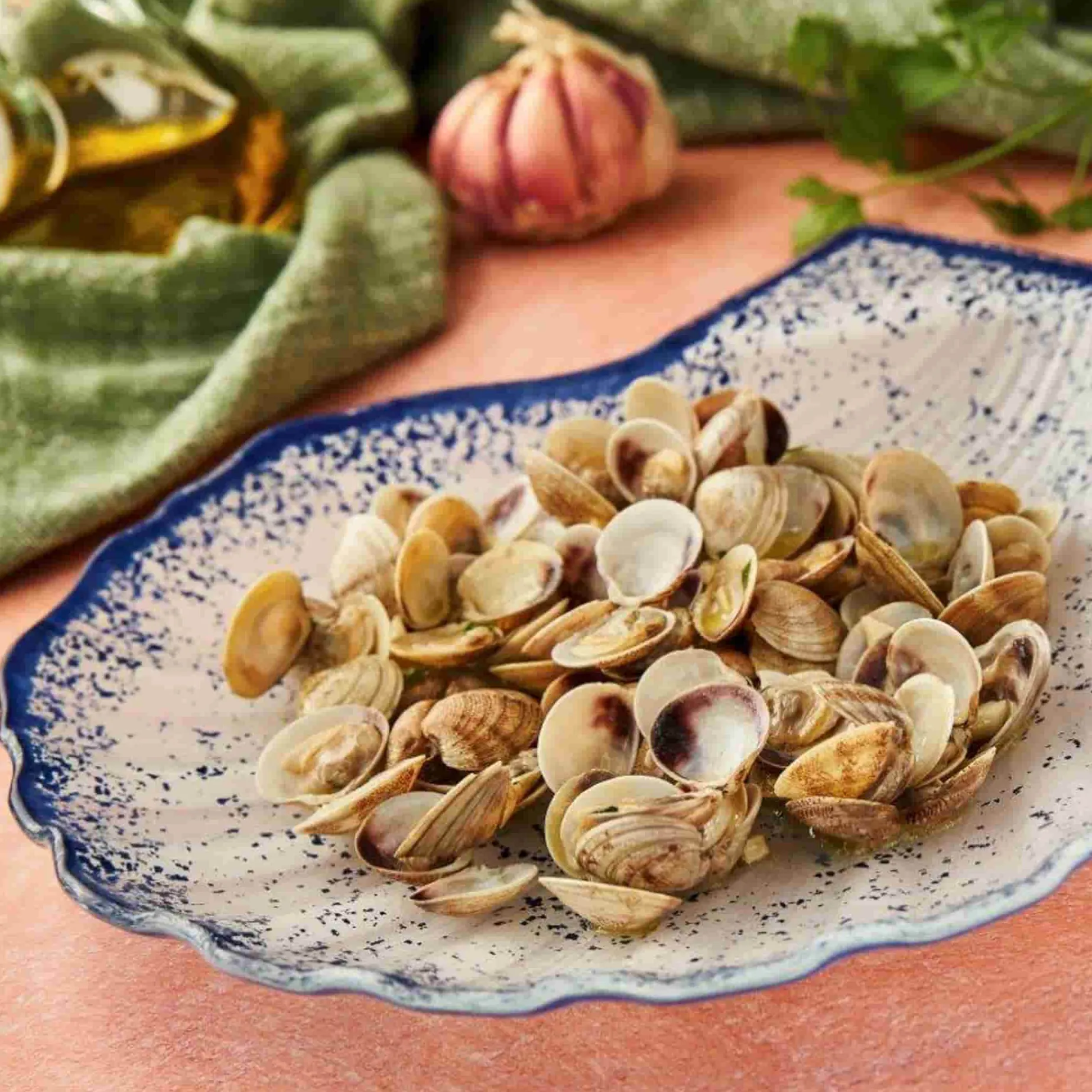 Use this glass scallop platter to serve seafood in style. It has a cobalt blue rim and pale blue splatter pattern.