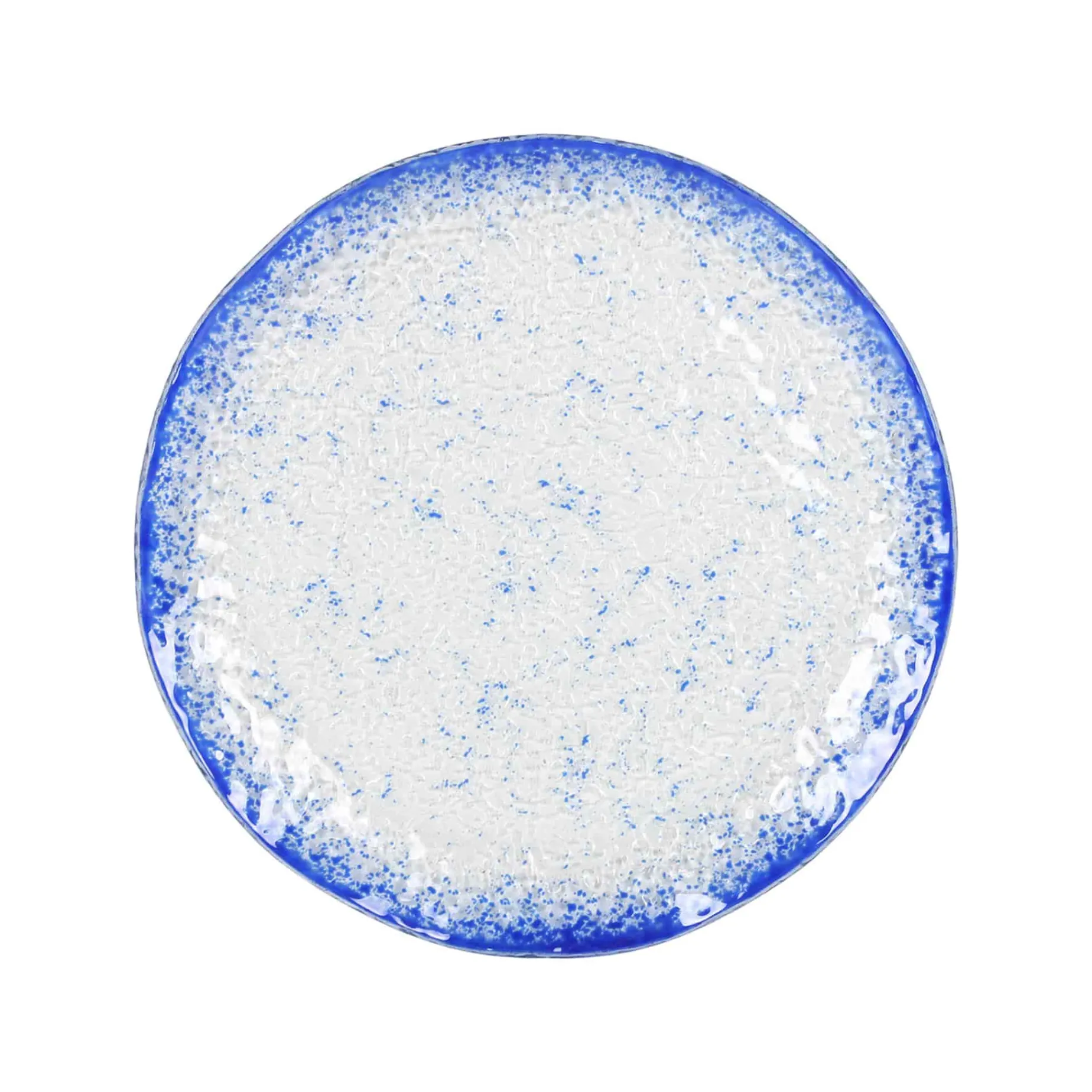 Dress your table with this beautiful glass charger plate. The plate features a cobalt blue rim and pale blue splatter pattern.