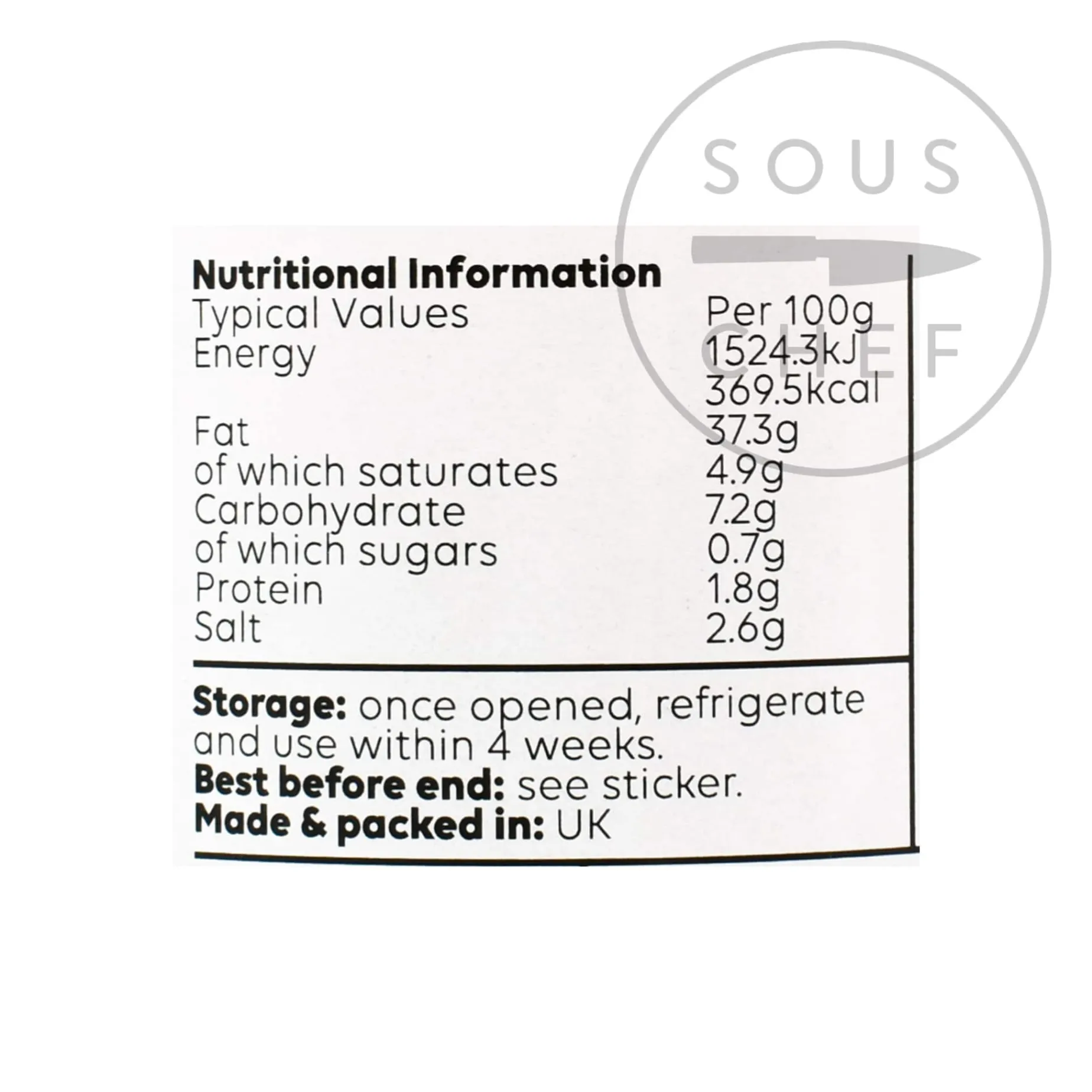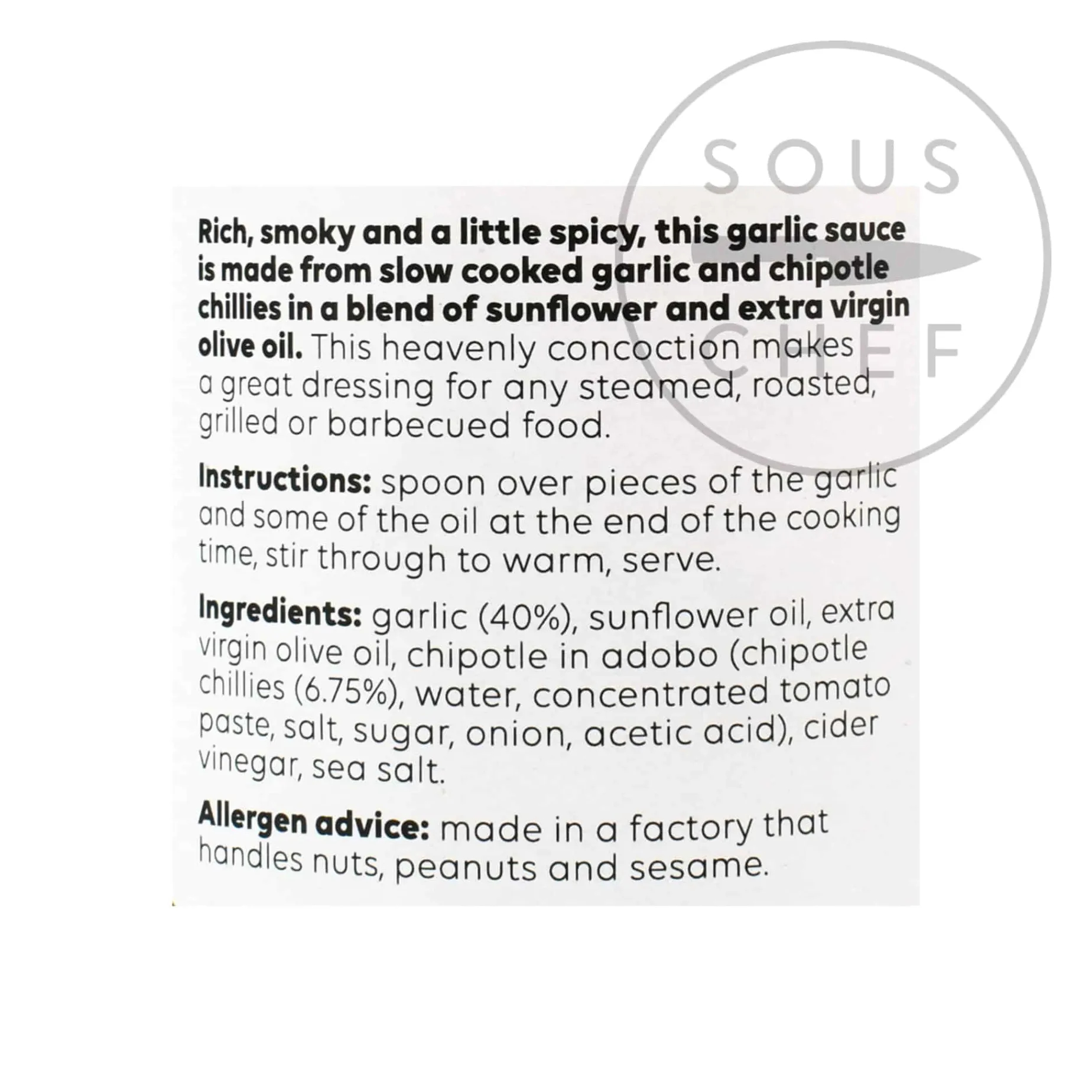 Product formulations and details may change. For the latest ingredients and allergen information always check product packaging prior to consumption. Ingredients: Garlic (40%), sunflower oil (26%), extra virgin olive oil (12%), chipotle in adobo (chipotle chillies (6.75%), water, concentrated tomato paste, salt, sugar, onion, acetic acid), cider vinegar, sea salt