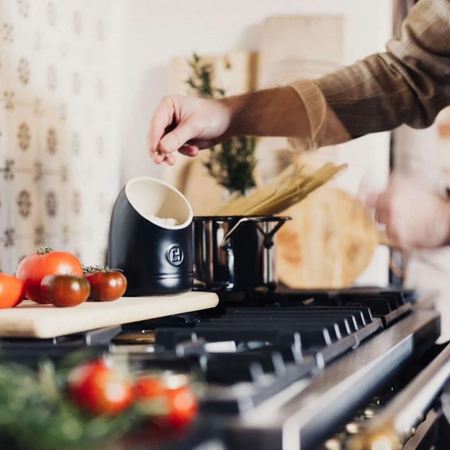 Emile Henry’s black salt pig is a stylish way to store salt. It has a large opening for quick and easy access. Made from durable ceramic, this salt pig is an elegant addition to your kitchen.
