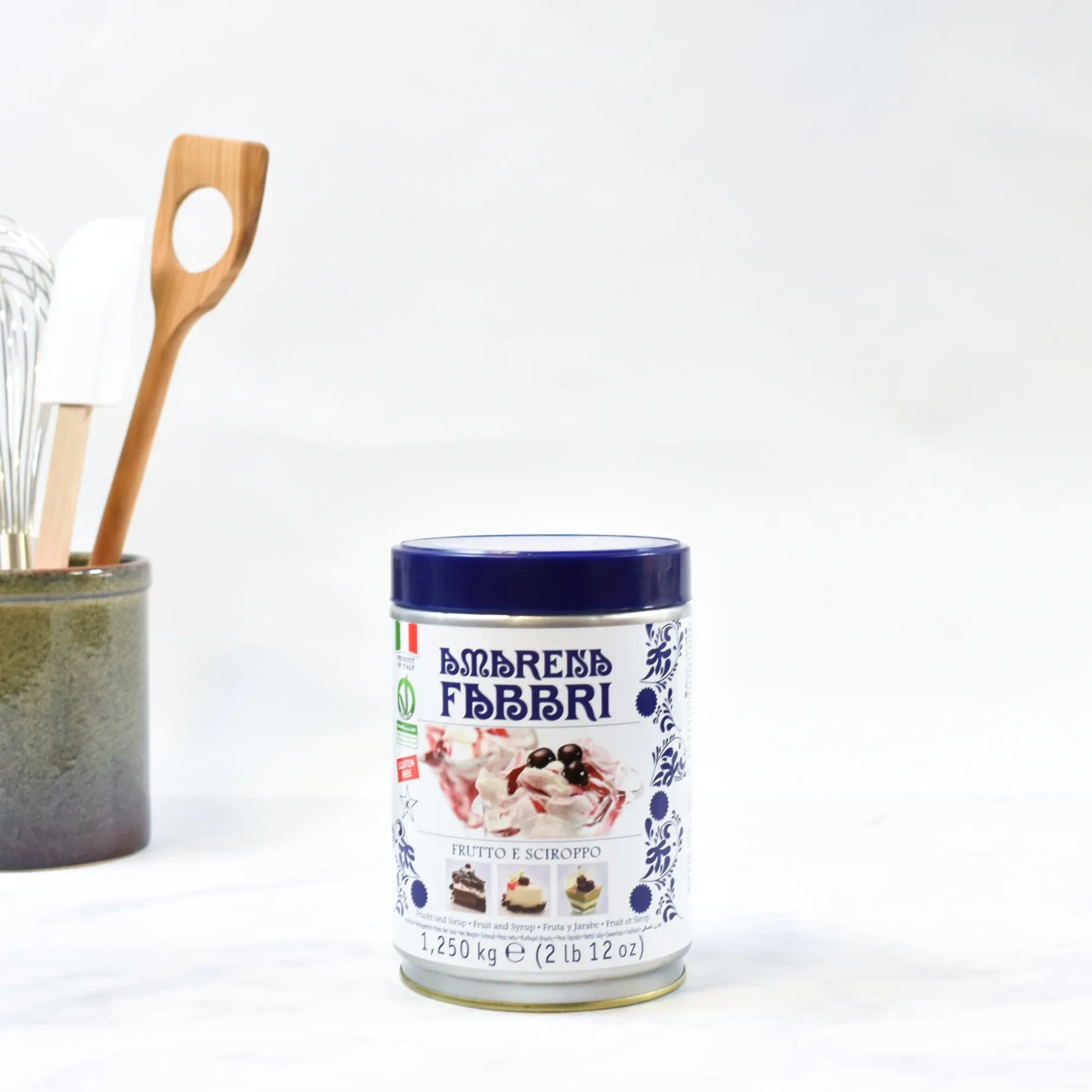 Fabbri Amarena cherries in syrup are world famous demi-glacé cherries in a a huge 1.25kg tin. The Amarena cherries are soft and juicy, with a pleasing sourness that balances the sweet syrup.