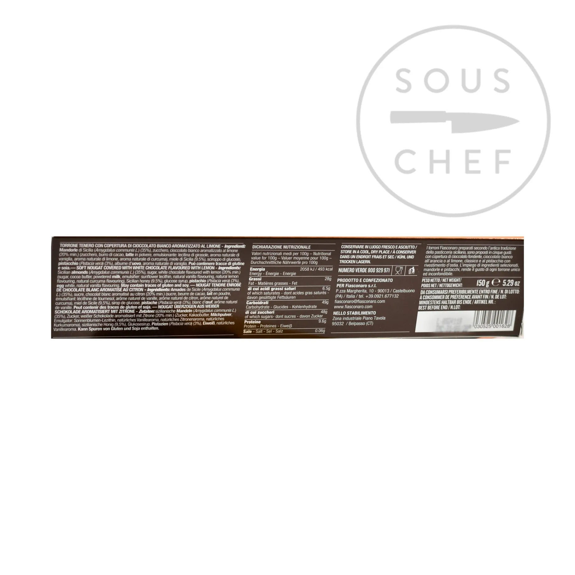 Product formulations and details may change. For the latest ingredients and allergen information always check product packaging prior to consumption. Ingredients: Sicilian almonds (Amygdalus communis L.) (35%), sugar, White chocolate coating with lemon (min. 20%) (sugar, cocoa butter, powdered milk, emulsifier: sunflower lecithin, natural vanilla flavouring, natural lemon flavouring, natural curcuma flavouring). Sicilian honey (9.5%), glucose syrup, pistachio (Pistacia vera) (3%), egg white, natural vanilla flavouring. Allergens are listed in bold. May contain traces of gluten and soy.