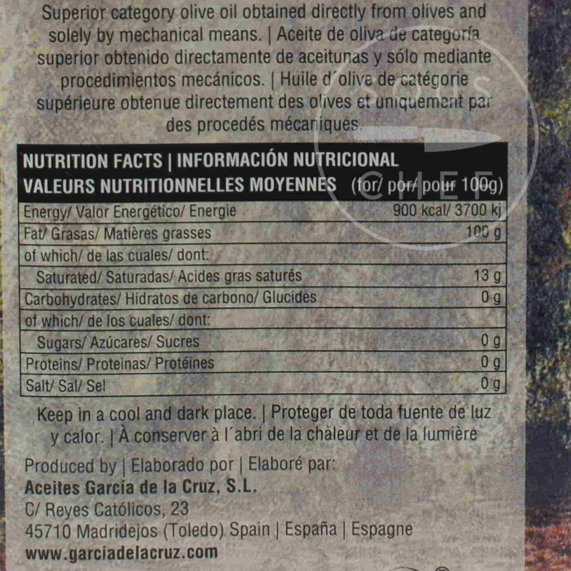 This coupage blend extra virgin olive oil is produced by Garcia de la Cruz in Castilla-La Mancha. It is a smooth, flavourful blend made with Picual, Hojiblanca and Arbequina olives. This superb Spanish olive oil is very stable when heated so it’s ideal for frying, roasting and sautéing.