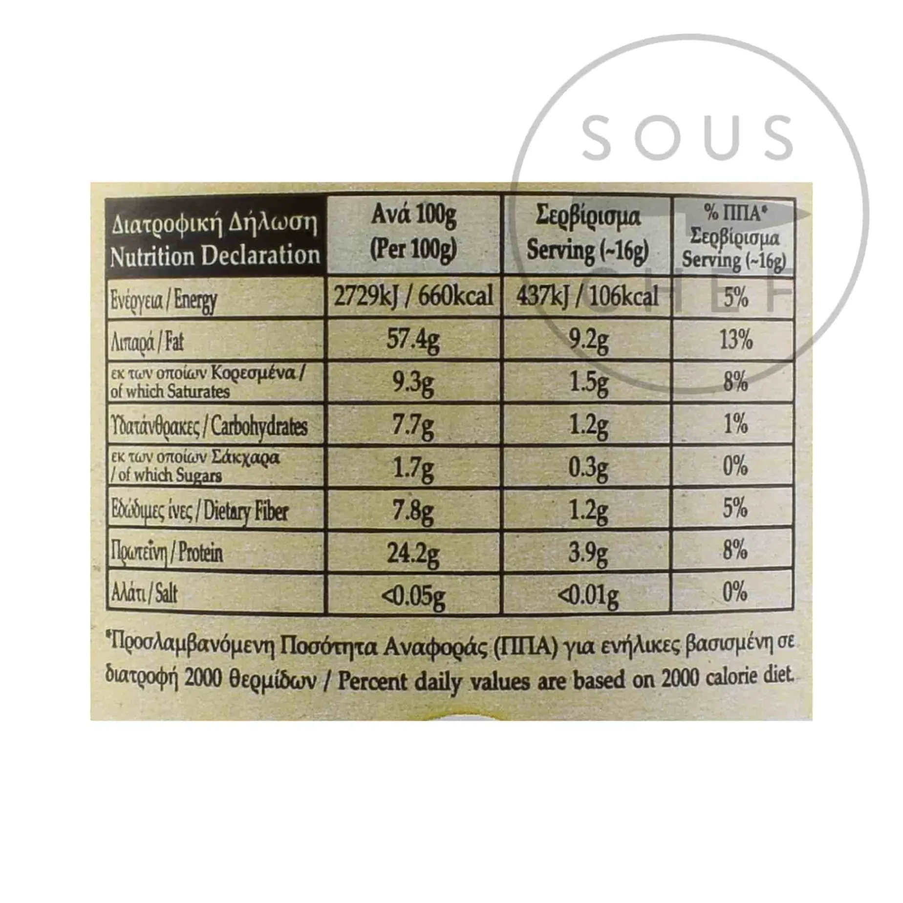 This Greek tahini is a rich and nutty spread made from crushed sesame seeds. When the seeds are ground, they create a golden, thick spread with a creamy texture. Tahini is a staple ingredient in Greek cuisine, it is a core part of Mediterranean flavours